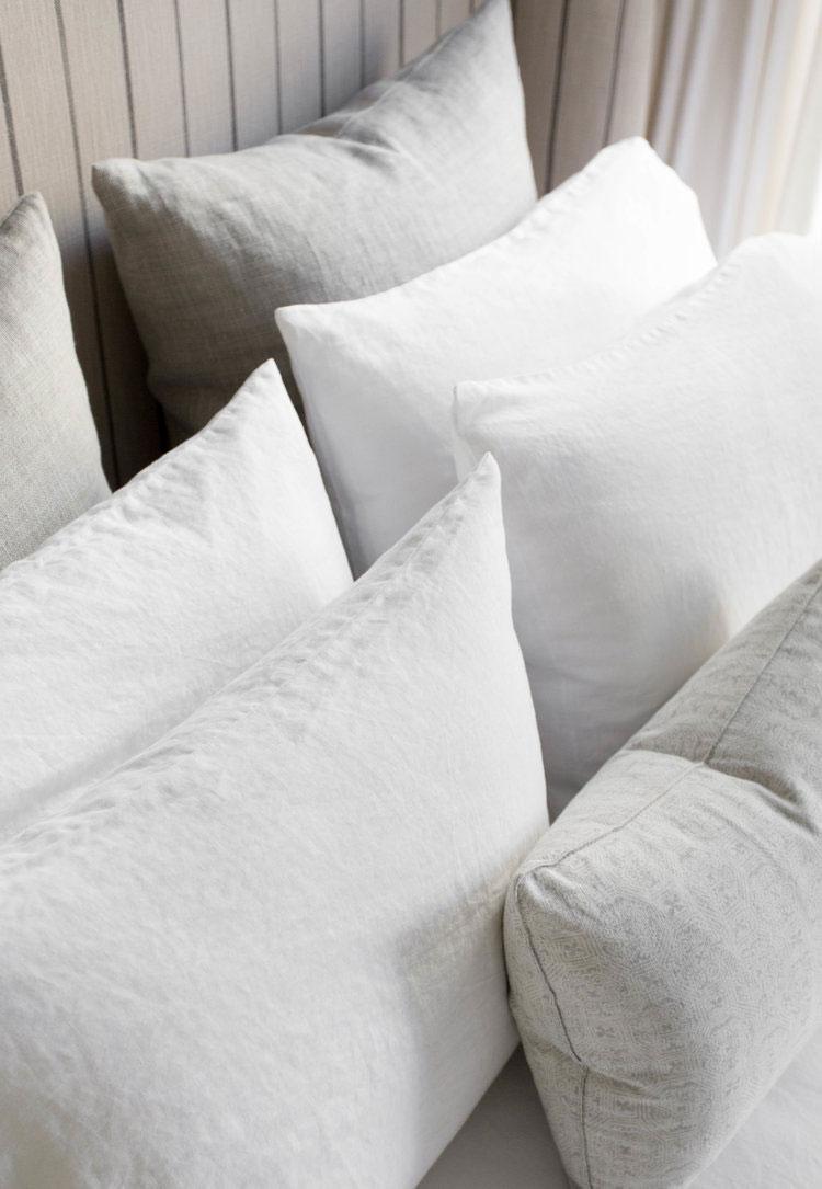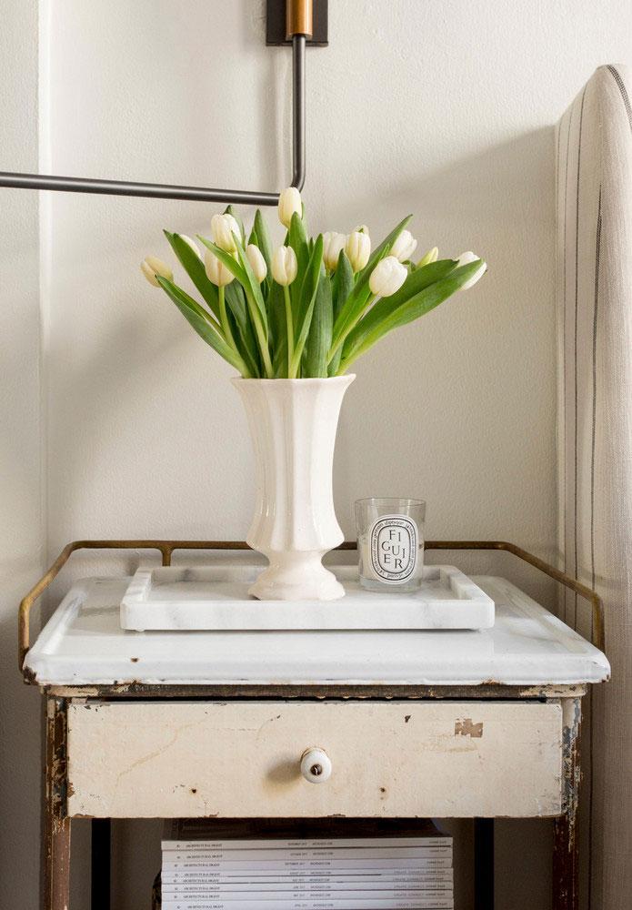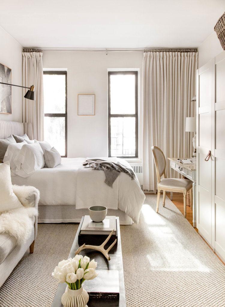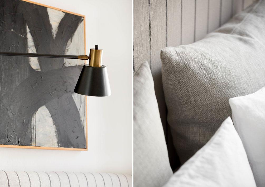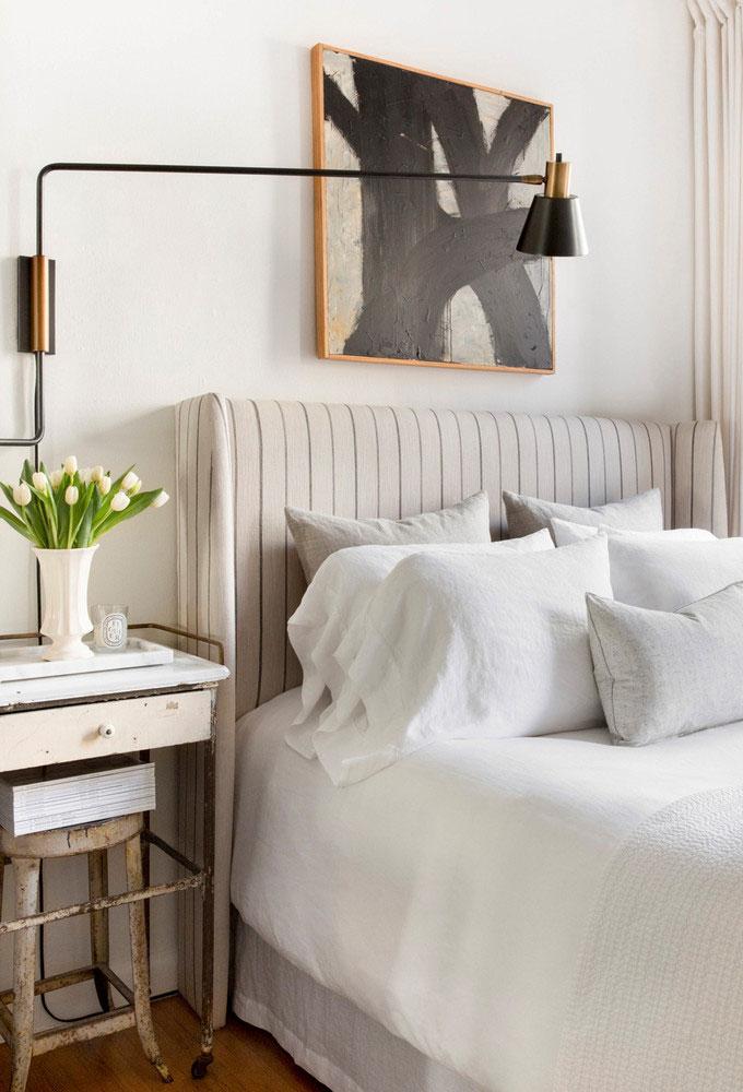 Todos las piezas siguen un mismo patrón de colores neutros y suaves, una manera de asegurar la sensación de amplitud y serenidad en un especio pequeño. Pero eso no quiere decir que sea aburrido, la interiorista jugó con las líneas, las formas y las texturas, como la alfombra de yute, los tiradores de cuero del armario, o la vieja pátina del carro de médico antiguo que se ha utilizado a modo de mesilla de noche. Otra ventaja respecto a los neutros es que son atemporales y según con las piezas que los mezcles, conseguirás un resultado más moderno o uno más tradicional, te permite además si te cansas, renovar ciertos elementos y sustituirlos por otros fácilmente ya que la base combina con todo.
