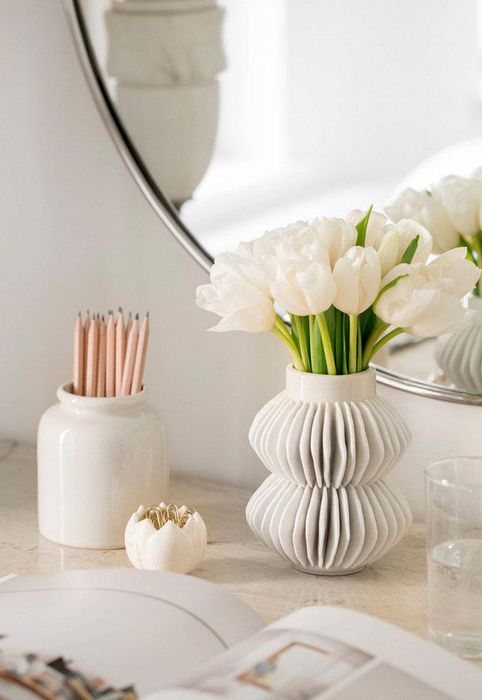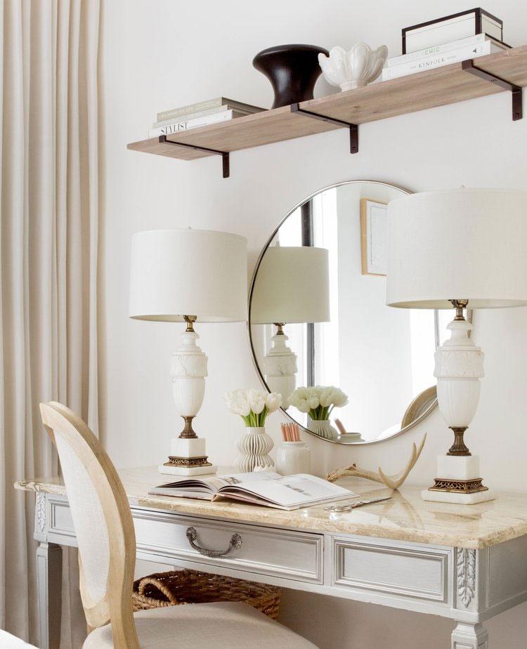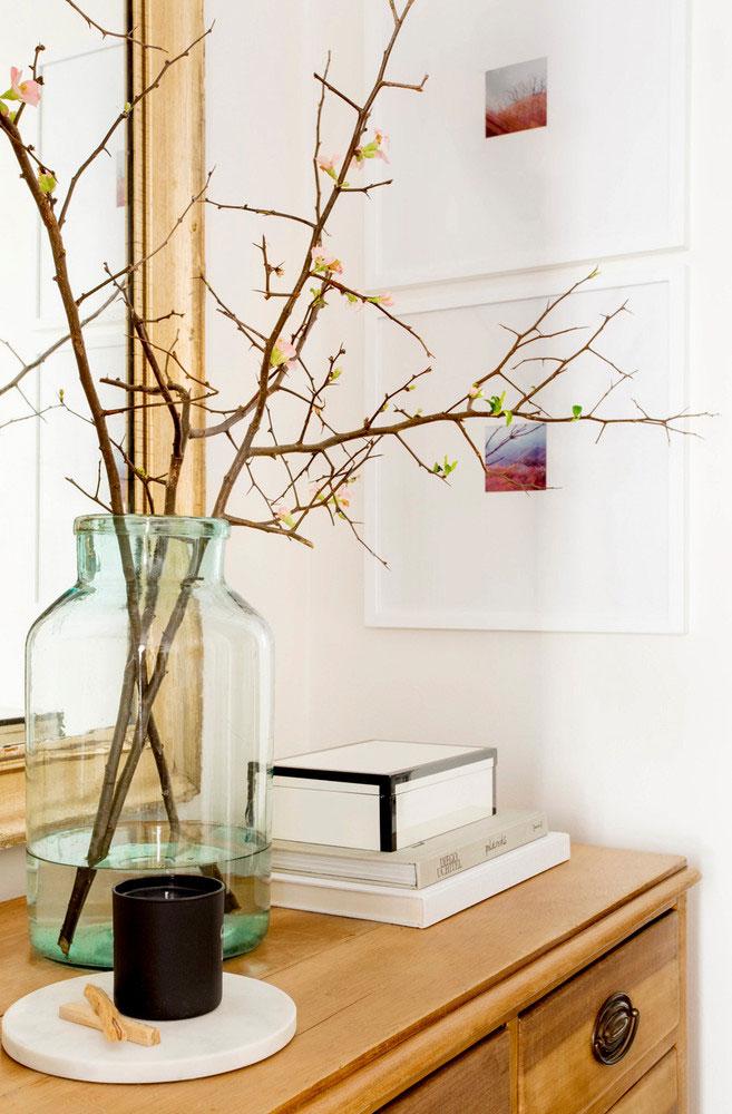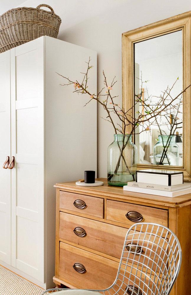 Siguiendo con los trucos para espacios pequeños, los espejos también tienen gran importancia. No sólo sirven para mirarnos, puedes ponerlo frente a unas ventanas para que rebote la luz natural, o entre ellas para hacerlas parecer más grandes, o sobre un escritorio para duplicar el espacio al encender la luz,… son grandes aliados. Otro truco es añadir alguna antigüedad o pieza de época ya que aportan personalidad y carácter al mezclarlas con otras más modernas. En este caso además, se ha optado por otro recurso, a pesar de no tener grandes ventanas las cortinas van de lado a lado de la pared y de techo a suelo, de esta manera también se crea la ilusión óptica de que éstas son más grandes.
