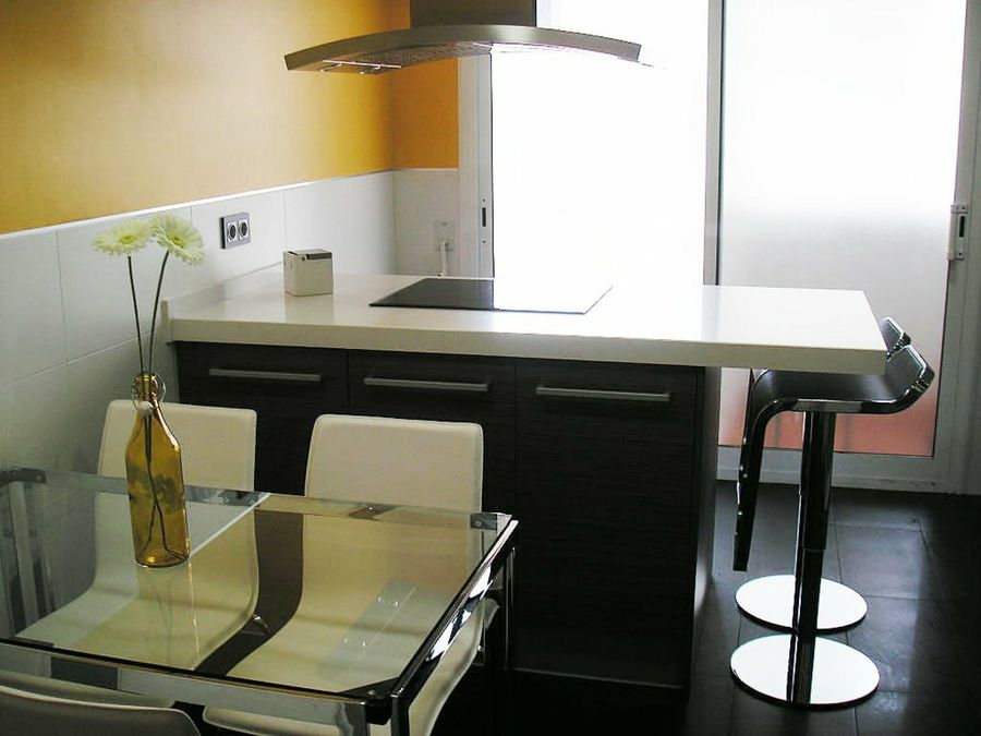 Por último, la opción más común y tradicional es hacernos un pequeño comedor en la cocina. En este caso, debemos buscar la diferenciación de la zona de office de la zona de trabajo. Lo mejor es optar por colores diferentes o algún cambio en el revestimiento como papel pintado, algún vinilo... Para dar claridad, lo mejor es situar la mesa lo más cerca posible de la ventana y alejada de la zona de fogones.