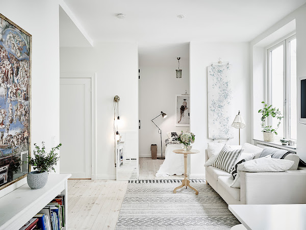 Es cierto que el blanco es el protagonista, pero acompañado de algunas pinceladas de color, cómo el cuadro sobre la consola de la sala de estar, que le da un toque de lo más ecléctico, o los tonos oscuros de grises y negros en los cojines y en la alfombra, y también vemos alguna pinceladas de oscuro en el baño con su suelo damero y en la encimera de la cocina.