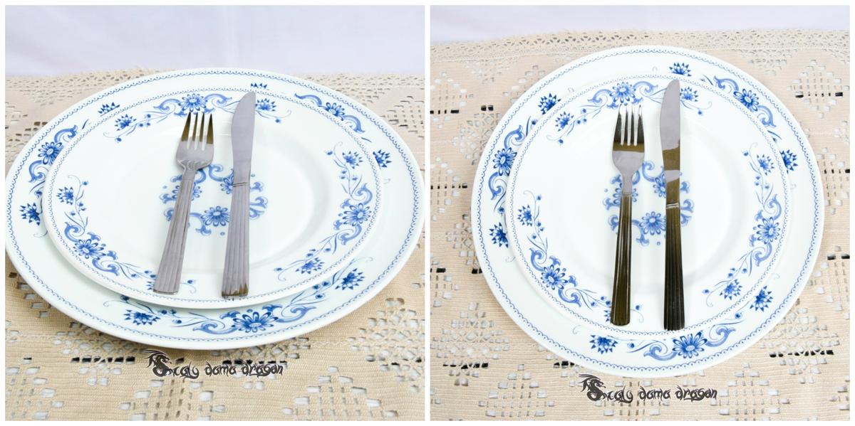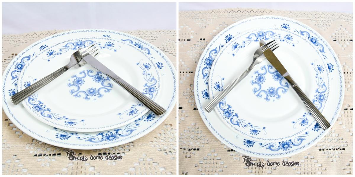 Para mostrar que ya hemos finalizado un plato o no nos apetece continuar con el que estamos degustando debemos colocar los cubiertos formando una cruz. De esta forma estamos transmitiendo al camarero o mesero nuestra intención de ya puede retirar el plato.