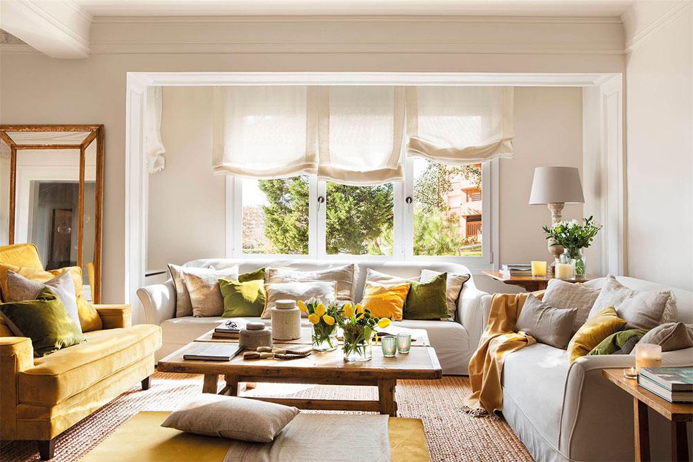 Y a lo que venía este post, el mostaza omnipresente en todos y cada uno de los espacios, ya sea en los textiles del salón, vajillas, mantelerías, pufs, adornos en el cuarto infantil, cojines del dormitorio principal e incluso las flores, también el dorado del espejo recuerda a este color. En definitiva, el mostaza utilizado en menor o mayor medida hace que, a pesar del mix existente en materiales y estilos, se vea un hilo conductor que lo unifica todo. Y vosotros ¿recurrís al color como elemento de unión o cada estancia tiene su propia identidad?