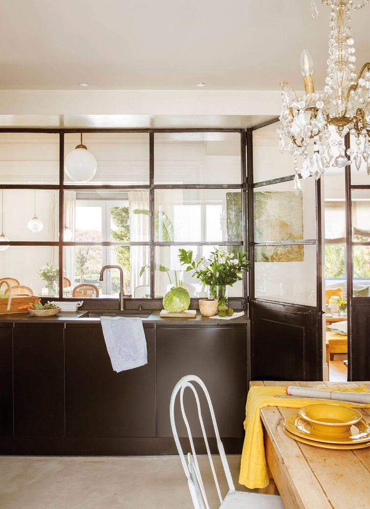 Continuando con la casa, se distribuyeron los espacios con el fin de conseguir la mayor amplitud posible. Por ejemplo, se eliminaron dos habitaciones para crear un salón más amplio, se prescindió también de un pequeño pasillo que hacía las veces de hall de entrada y se recurrió a crear elementos a medida que dejaran pasar la luz, como el acristalamiento de la cocina.