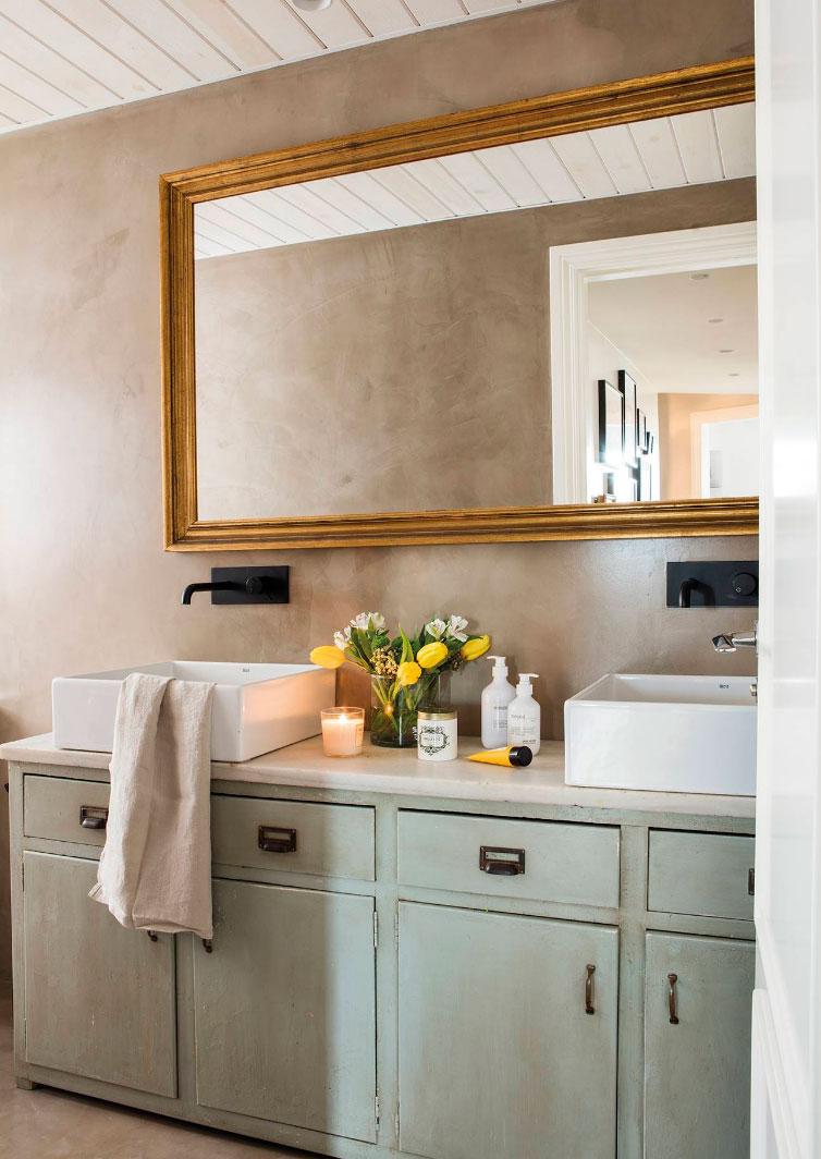 En la casa se recurre a los continuos contrastes, un ejemplo claro es la antigua lámpara de araña de la cocina junto a la estructura metálica que se ha utilizado como cerramiento en la misma estancia. O las puertas utilizadas en el armario de la habitación infantil, son de los años 30 y se recuperaron de una casa anterior, contrastan con el toque desenfadado de las fibras naturales de la alfombra. En el baño también se ha jugado con las mezclas, por un lado un gran espejo antiguo dorado preside el espacio, rompe su estética la grifería negra de corte moderno, un mueble de madera pintado que si me dicen que ha sido recuperado de una cocina, me lo creería, y por último la estancia se ha revestido con microcemento. Revestimiento práctico donde los haya y por el que suspiro desde hace años. Otro inciso por si buscáis una buena empresa que realice proyectos con este material, os recomiendo a Futurcret.