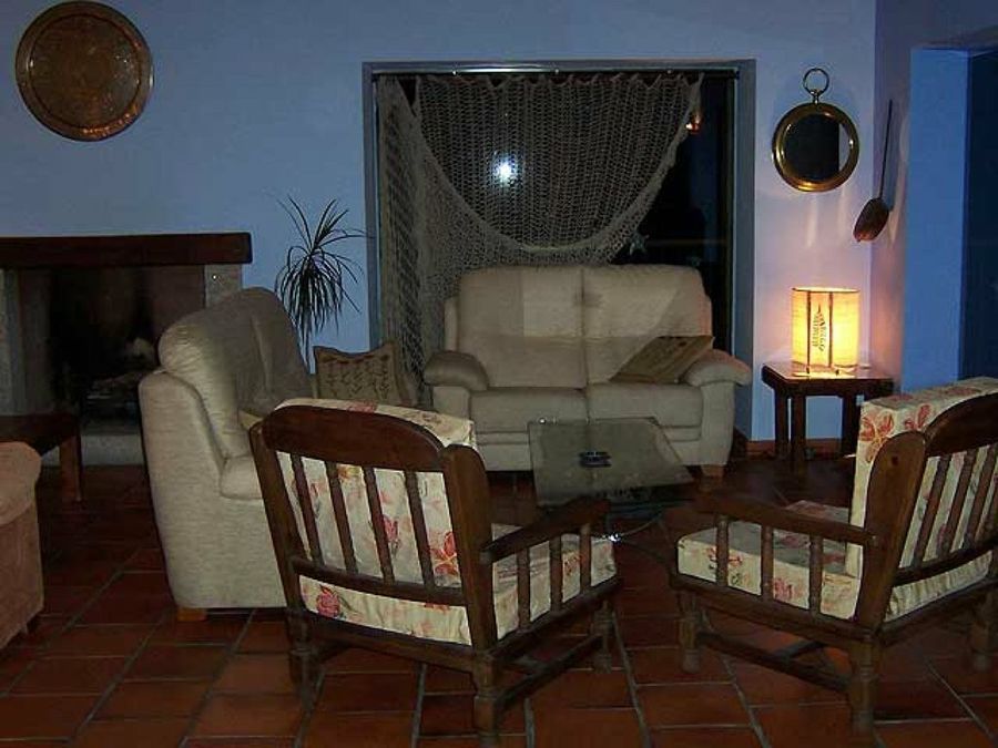 El salón es un rincón muy apreciado, puesto que el paisaje conforta nuestra vista a lo largo del día y la chimenea aporta un aire entrañable y cálido a las noches. Los sofás están tapizados en telas claras de texturas suaves, respetando el azul celeste de las paredes. Dos butacas con estampados florales compiten por ser los rincones más cómodos.