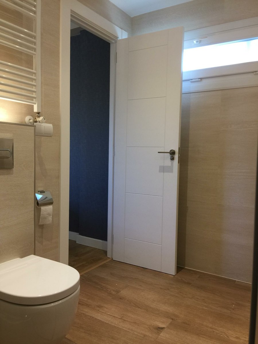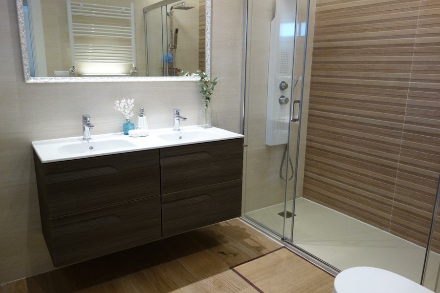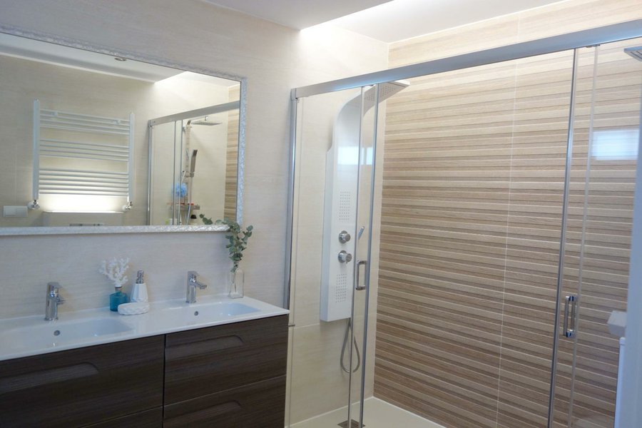 Y por último pero no por eso menos importante, es necesario el cuidado de la iluminación en un baño compartido: ambiental en foseado led en ducha, focos empotrados e iluminación decorativa en cajeado de la cisterna. Ambos están encantados con el resultado, y yo con ganas de renovar mi propio baño ¿me entendéis no?