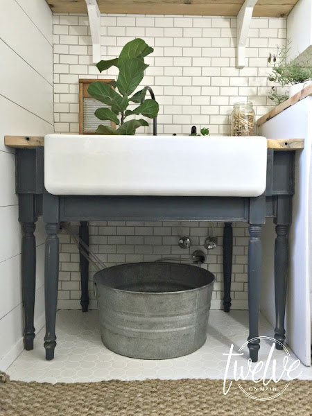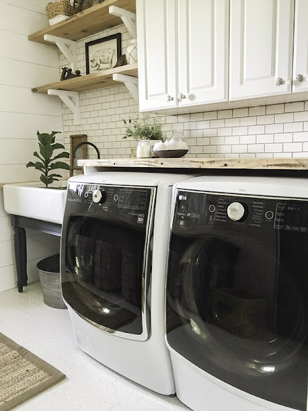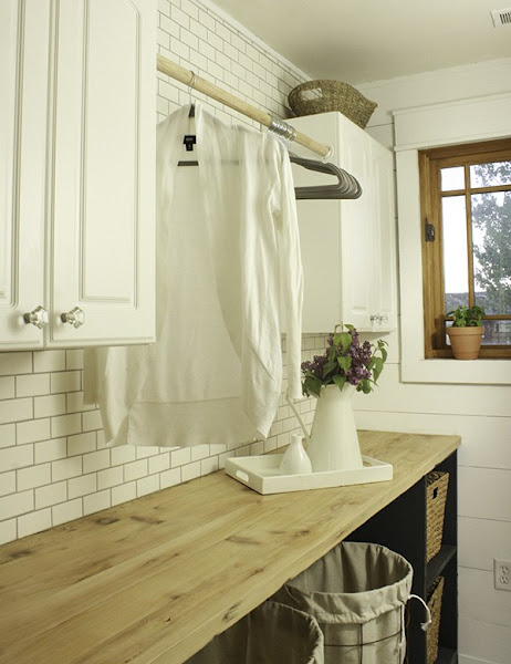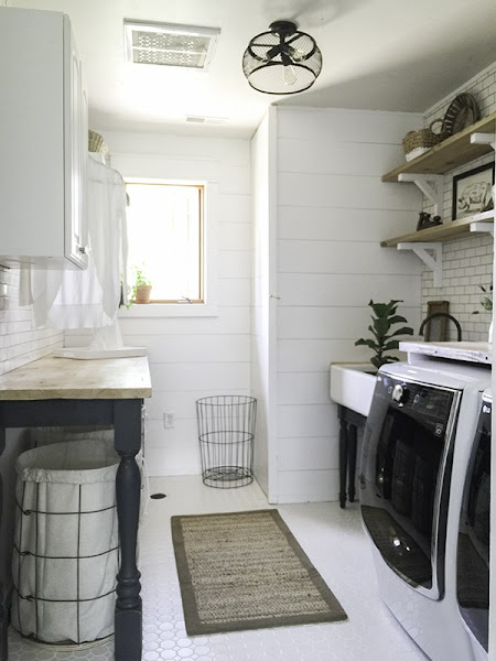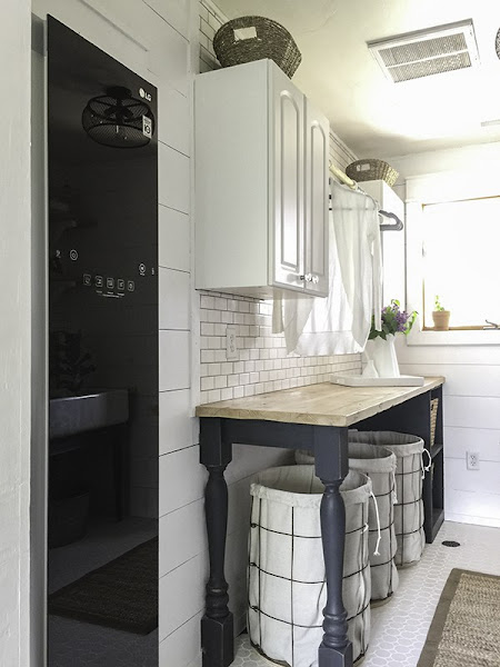 De estilo rustico pero renovado, recordando como si estuvieras en una granja, azulejos tipo metro, madera en la pared. En la distribución de la zona de lavado se opto por una pared donde ubicar los electrodomésticos y otra para el almacenaje y organización, donde se ubicó unos armarios que ya estaban aprovechando la parte superior de la pared y una mesa. Ya que la habitación tampoco era muy grande se le saca el máximo partido a cada rincón como debajo de la mesa para colocar cestos para la ropa sucia incluso ropa de plancha.