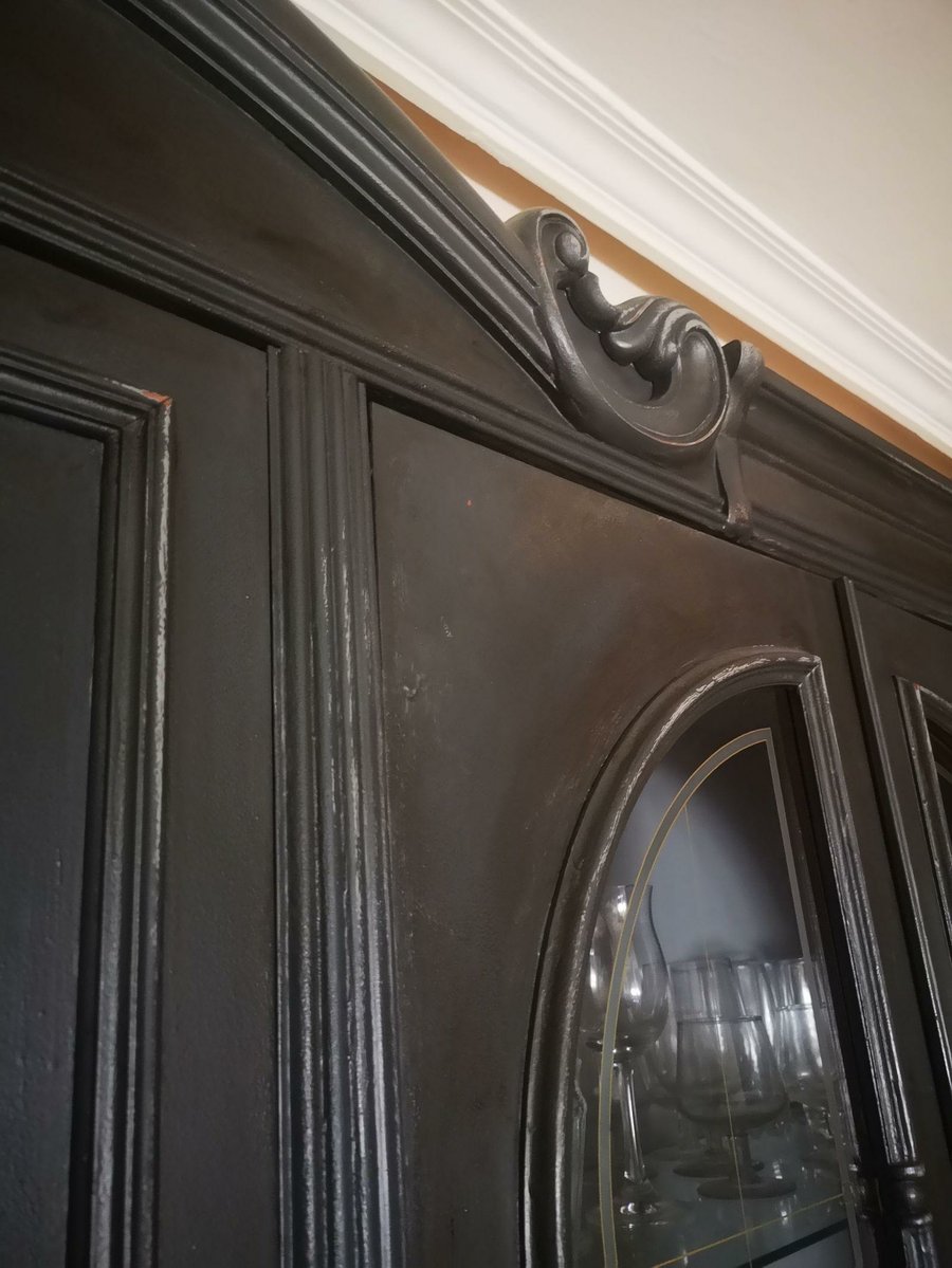 Para pintarlo usé una pintura de doble componente, para así evitar el uso de una imprimación, y aunque al principio no estaba muy convencido el resultado fue realmente bueno. El color elegido, el gris oscuro que además de ser tendencia, aporta elegancia y un estilo contemporáneo a partes iguales. Para que la pintura quede totalmente protegida y además la pieza adquiera sensación de lacado y perfección utilicé, a parte de a la hora de aplicarla, un rodillo de espuma para evitar los excedentes y tras su completo secado apliqué con un trapo cera incolora para muebles y un poco de betún de judea. Todo ello ayuda destacar y potenciar algunas partes del mueble, cómo son las molduras o el copete en la parte superior.