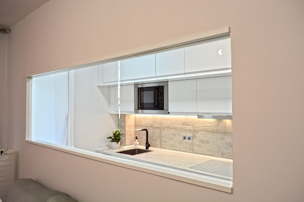 Aprovechamos para abrir un hueco en la pared y comunicar la cocina con el salón sin dejarlo completamente abierto, una opción que la propietaria escogió ya que no lo quería totalmente abierto el espacio.