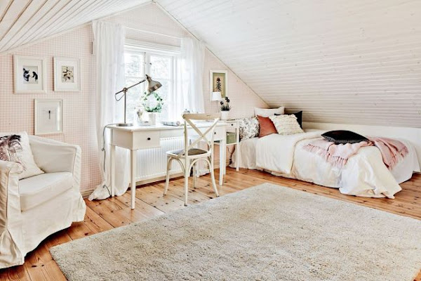 Los amplios espacios de esta casa se ven potenciados por el suelo de madera blanco y las paredes todas de un blanco inmaculado, exceptuando en la cocina donde un alegre papel pintado en tonos verde y gris pone la nota de color.