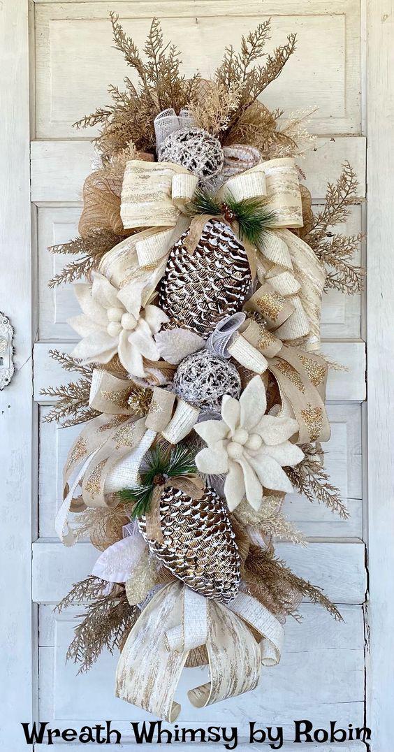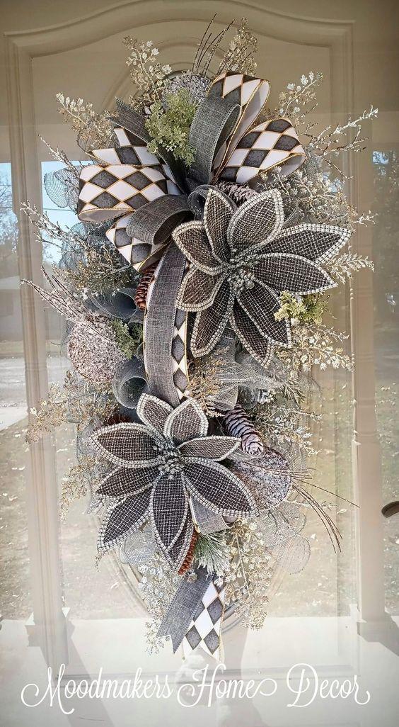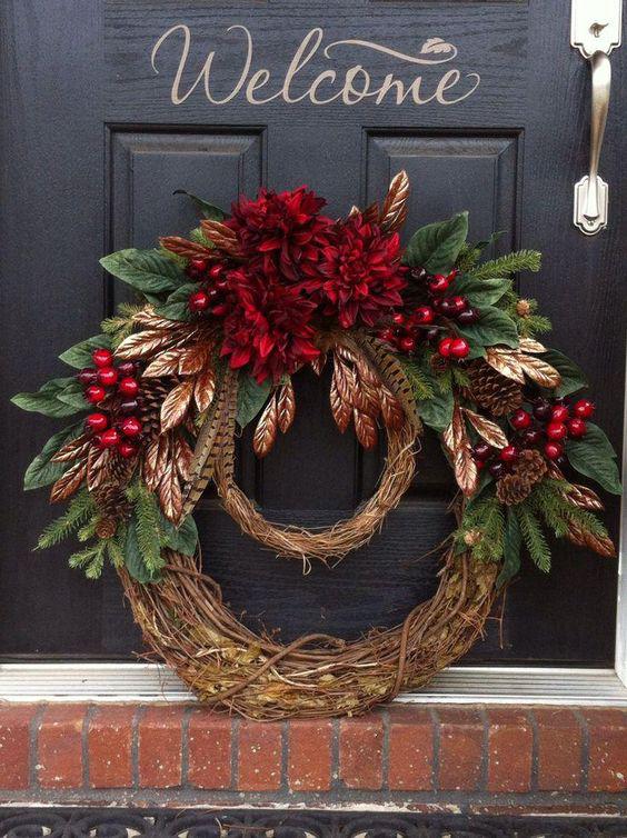 Para hacer más llamativos los Arreglos para la entrada de la casa en navidad te propongo utilizar el rojo y el café metálico para elaborar lindas Manualidades navideñas para deocrar la entrada con listones… Aquí jugarás con dos listones uno en yute y otro más decorado.
