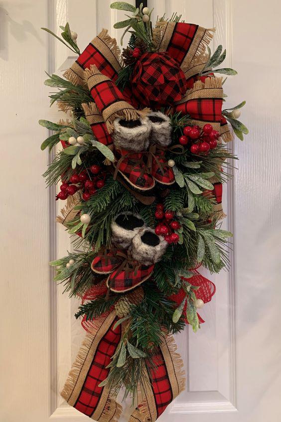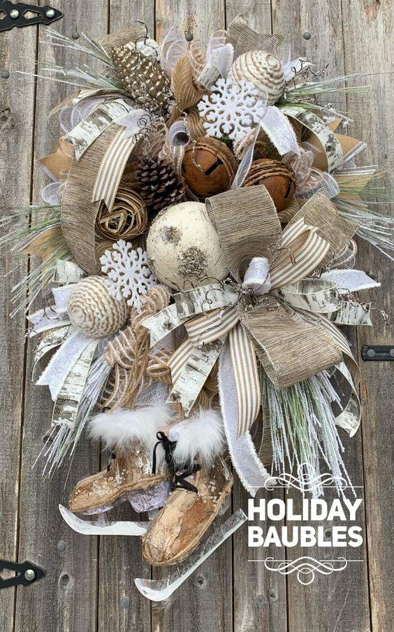Para hacer más llamativos los Arreglos para la entrada de la casa en navidad te propongo utilizar el rojo y el café metálico para elaborar lindas Manualidades navideñas para deocrar la entrada con listones… Aquí jugarás con dos listones uno en yute y otro más decorado.