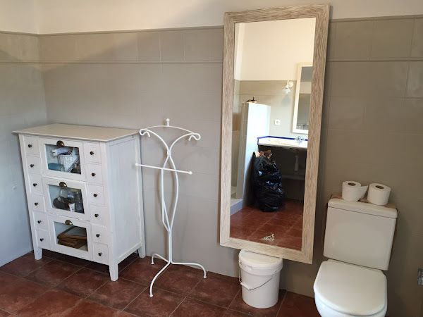 En este baño se ha pintado todo, excepto la puerta. paredes, azulejos de pared, encimera, baldas, apliques de pared, muebles, espejo, perchero y suelo.
