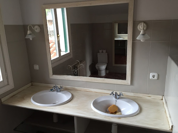 El mueble, el perchero y el espejo están lacados en blanco roto. El espejo al igual que la encimera, se envejeció también con betún de Judea. Aquí el suelo aún no se había pintado.