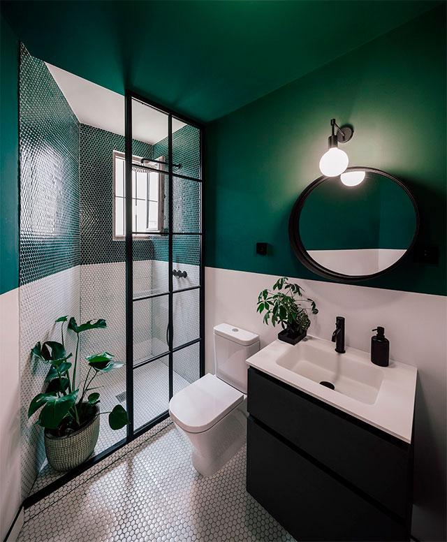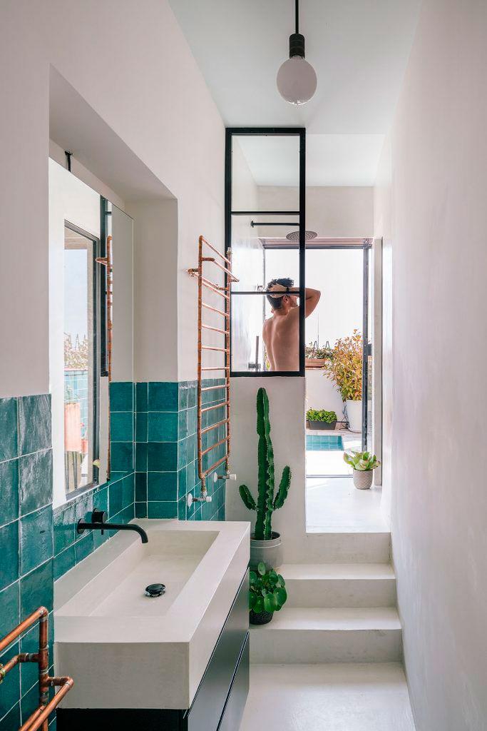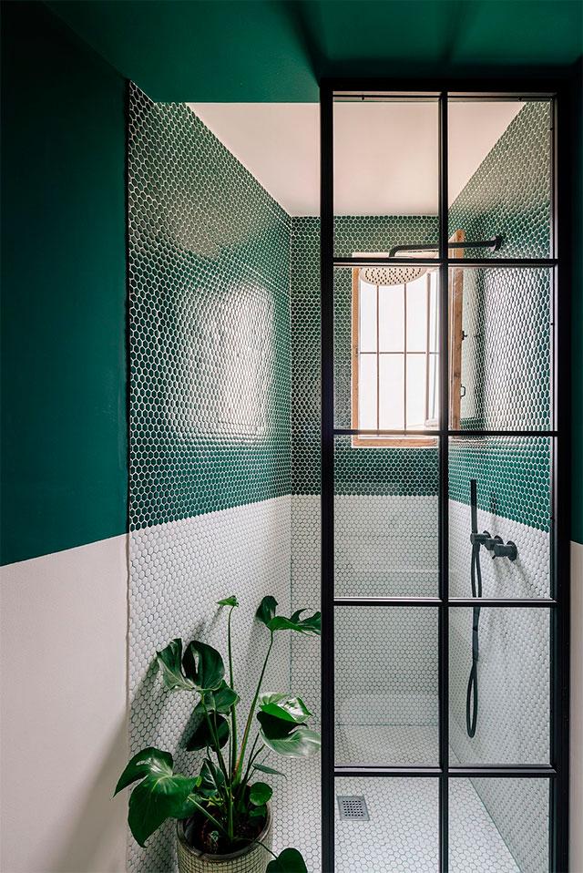 Subiendo por las esculturales escaleras del salón, en un nivel superior, está el dormitorio principal bajo la cúpula de la que os hablaba. Y junto al dormitorio, se encuentra el baño principal, elegantísimo en tonos verdes y negros, que además cuenta con luz natural. Del dormitorio se sube a la terraza, por una escalera temeraria :-), pero el esfuerzo merece la pena. Puedes hacer un poco de Yoga y luego darte una buena ducha bien en el baño o en la terraza, a tu elección, para luego preparar una estupenda barbacoa y si hace calor, darte un baño en la piscina con una cervecita fresca mientras disfrutas de las vistas de Madrid, no se me ocurre mejor plan.