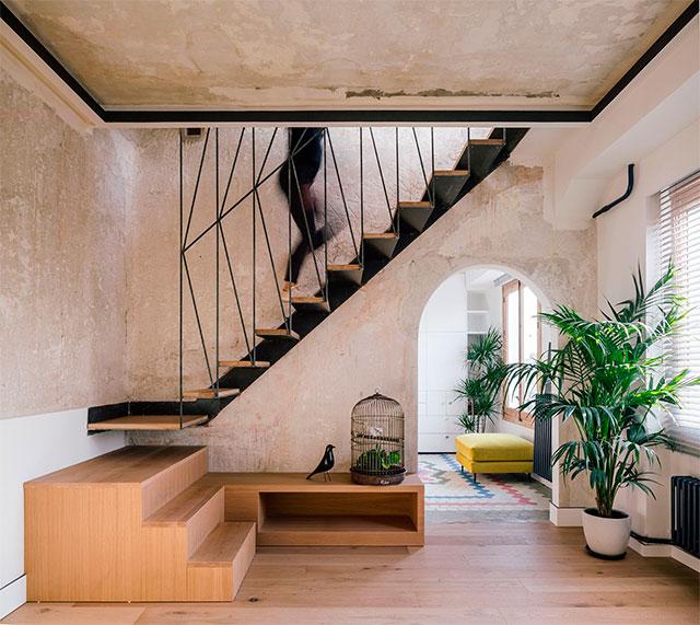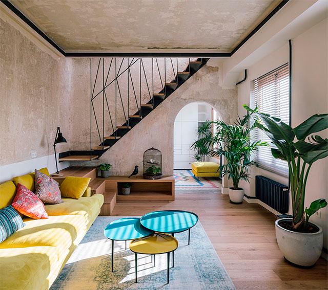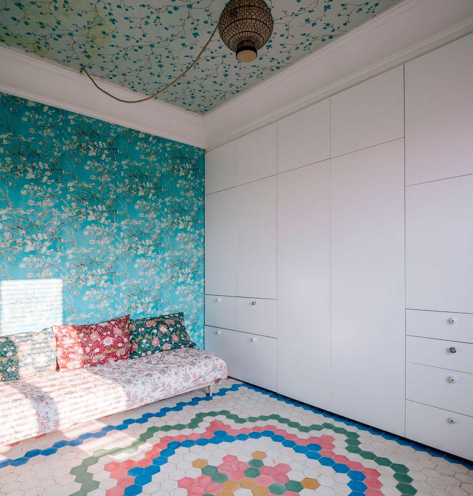 En la planta baja se distribuyen las zonas comunes. Un espacio abierto que alberga el salón comedor y la cocina junto a la sala de estar. Como veis los colores no son un problema, los hidráulicos originales del suelo tienen su réplica en los textiles del sofá, butacas, mesitas de centro o la otomana de la habitación contigua, destinada tanto a despacho como a cuarto de invitados, que tiene puerta corredera para poder cerrar a demanda. Allí todavía es más evidente el juego de color, con una mezcla muy potente de papel pintado tanto paredes como techo.