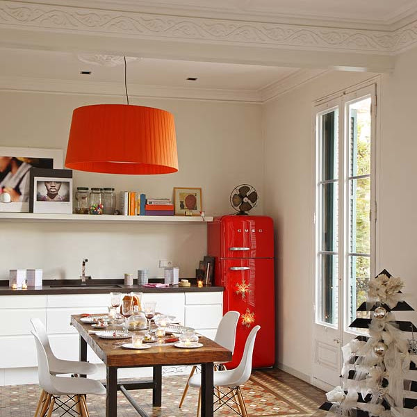 Me encanta este suelo por el colorido que tiene, y combina genial con la nevera Smeg en roja y la lámpara de techo.