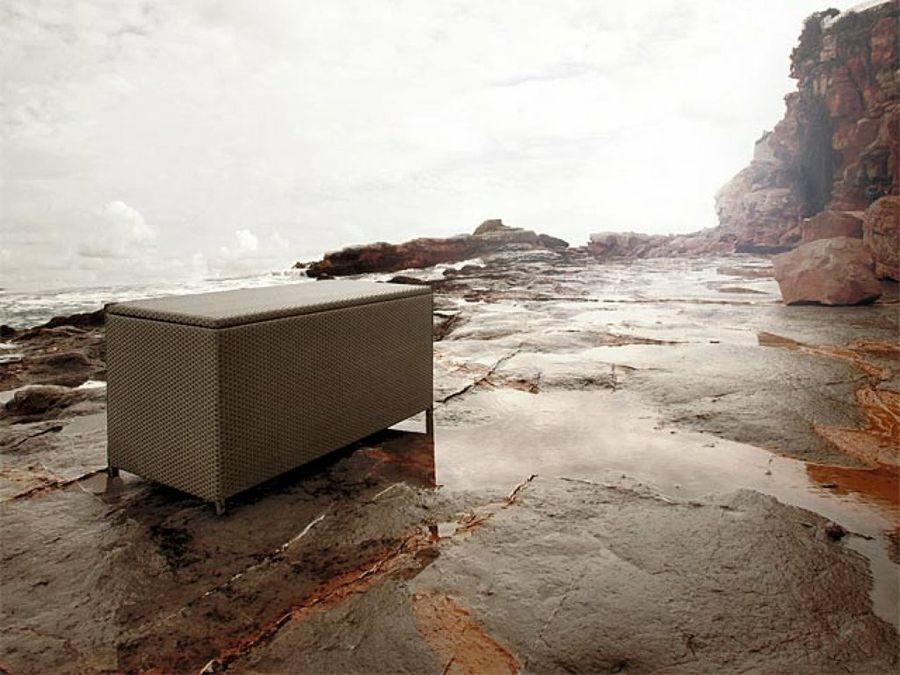 Entre los materiales con los que se fabrican los arcones, encontramos las fibras naturales y sintéticas. Los trenzados son perfectos si queremos darle un toque rústico a algún rincón de la casa. Este baúl contenedor de Portobello Street es de aluminio, pero está revestido de ‘viro’, un material muy resistente.