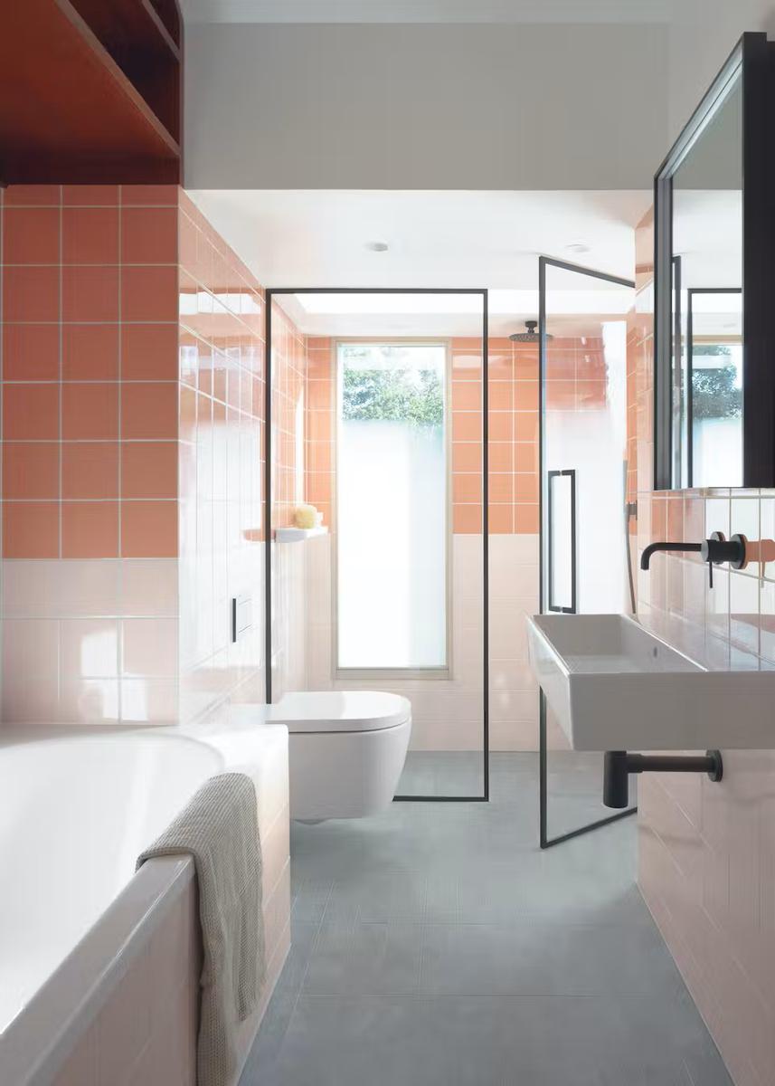 El baño de las niñas tiene azulejos en dos tonos color rosa y el suelo de cemento, combinado con perfilerías en los cristales y griferías en negro. Se encuentra junto a sus dormitorios y un estudio en la planta media, a la que se accede desde abajo mediante una escalera de caracol que conduce también hasta el ático. En la parte superior de la escalera, se hizo un tragaluz para que esta bonita escalera, de madera Douglas, estuviera siempre iluminada.