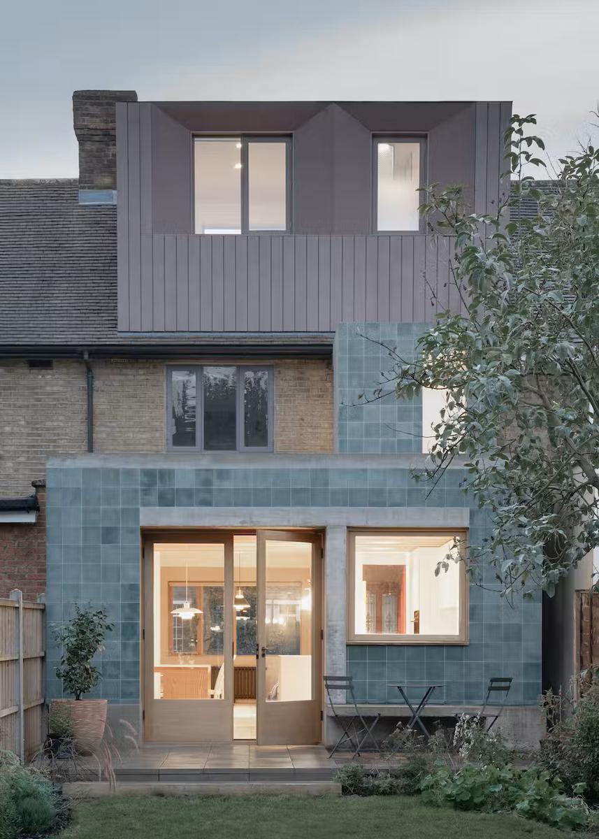 Vista desde el patio trasero, puede contemplarse cómo los mosaicos azules han ido perdiendo color con la exposición al sol, haciendo que cambie la estética de la casa, e incluso que se transforme con las distintas estaciones. El color y la textura de los azulejos, contrasta con los ladrillos del resto de la fachada típicamente londinenses.