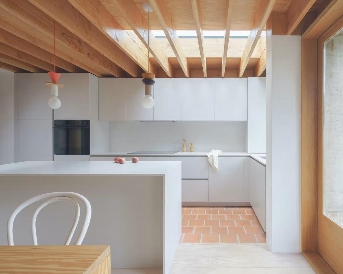 En estas dos estancias, al igual que las vigas del techo, los muebles y el suelo también son de madera de abeto, proporcionando continuidad y contrastando con los muebles y la encimera de cuarzo en blanco brillante, de Caesarstone. Sobre la mesa de comedor, la mítica lámpara de Louis Poulsen y las originales luminarias colgantes sobre la encimera, son de Schneid Studio. El área de la cocina lleva un suelo de terracota más sufrido, y tras la isla, donde se encuentra la zona de comedor, pasa a ser de madera de abeto.