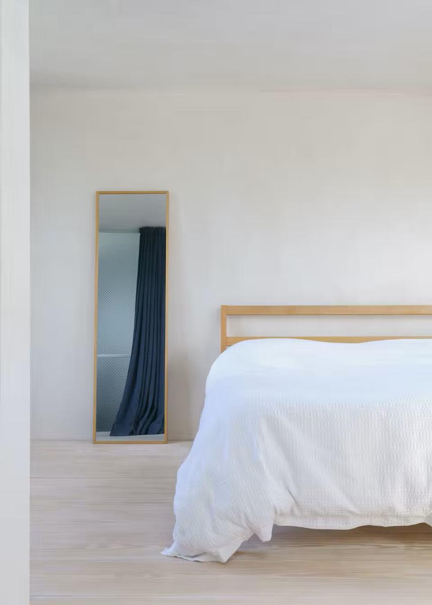 La escalera de la misma madera, está fabricada de manera escultórica haciendo referencia a los trabajos de Alvar Aalto. Por ella se asciende al ático, espacio que se destinó a la suite principal de la casa, con un aspecto más que minimalista. Poco más que una cama y un espejo cumplen su función, le acompaña el baño acristalado al que se le han añadido unas bonitas cortinas azules que le dotan de privacidad.