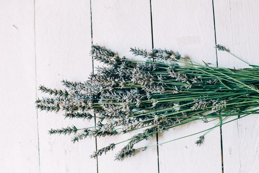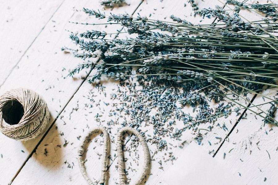 Materiales: Flores de lavanda, tijeras podar, tijeras, papel de horno y cuerda o bramante.