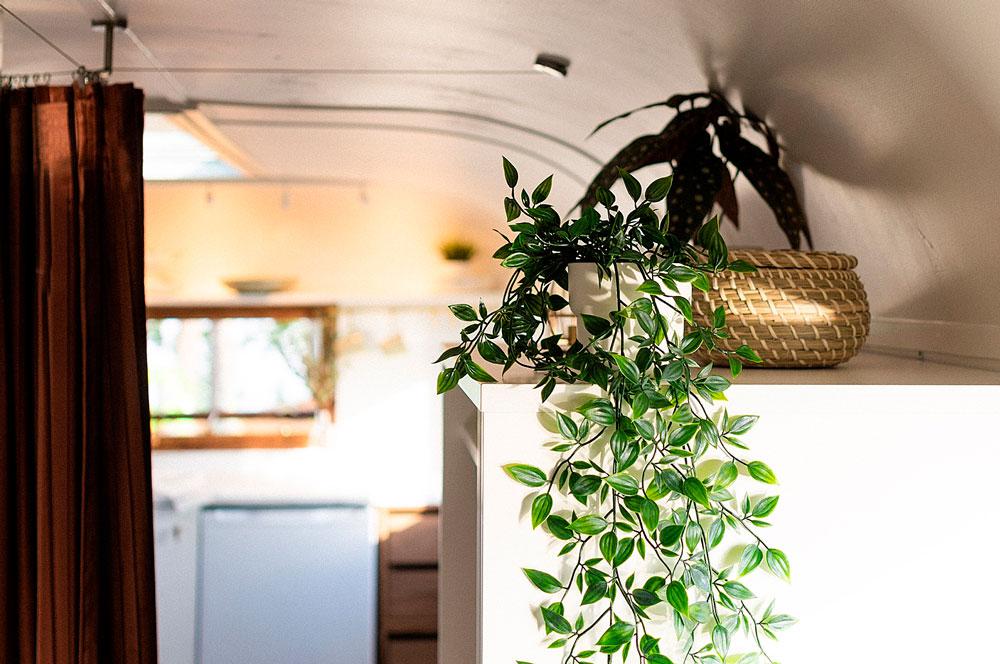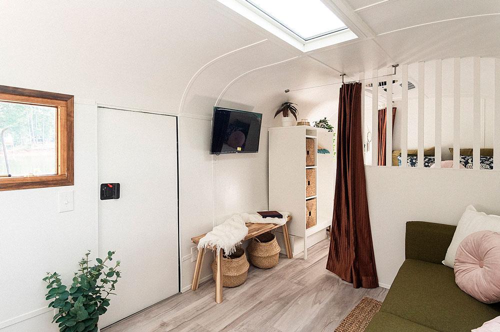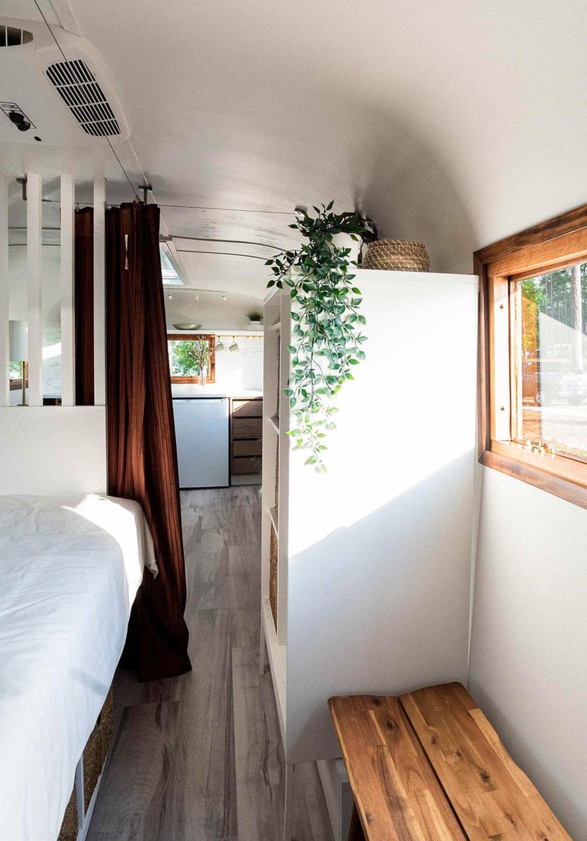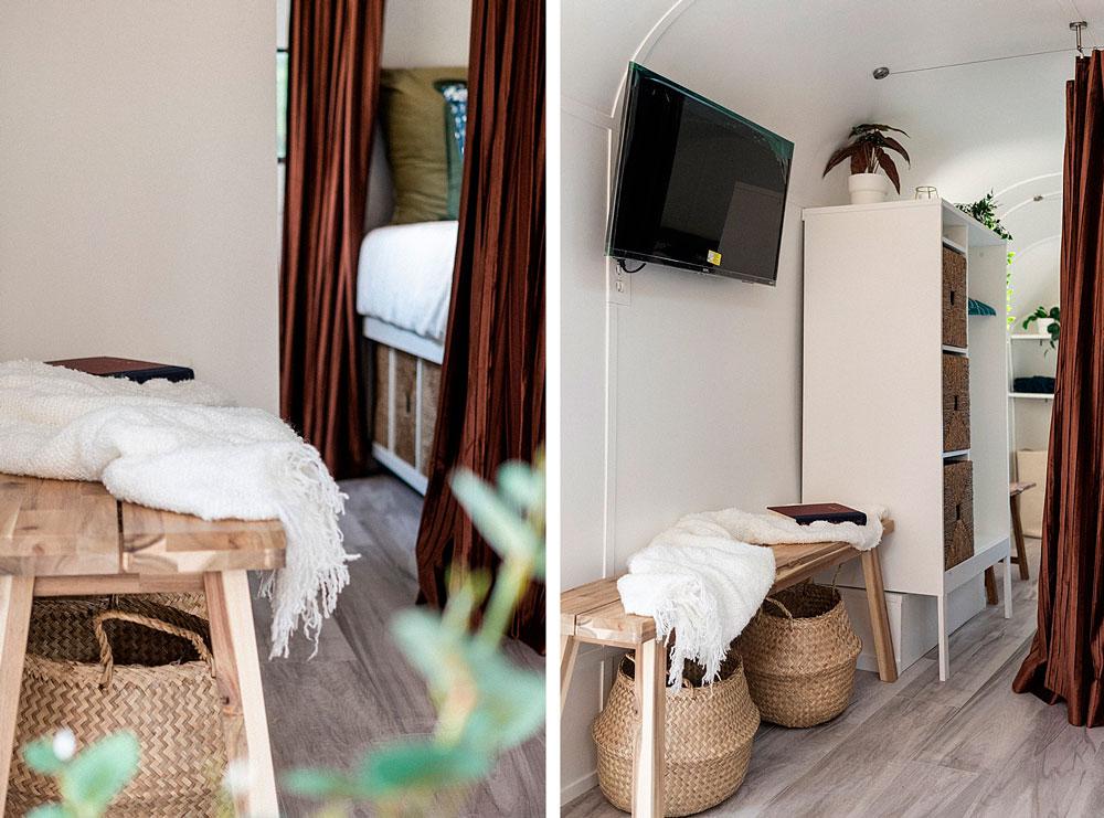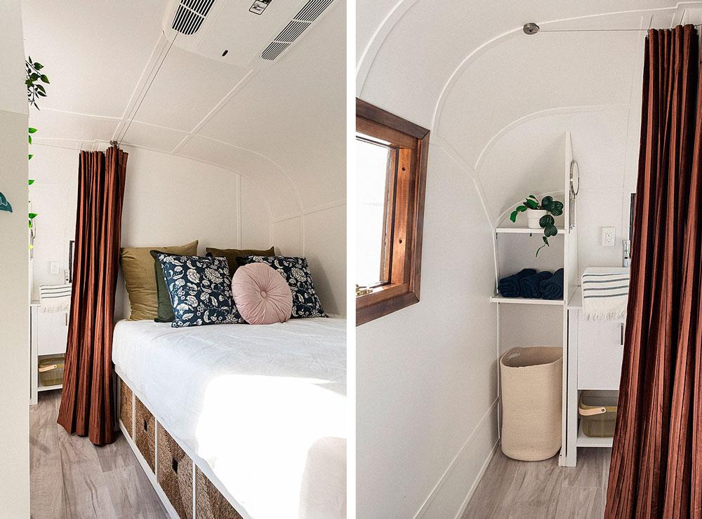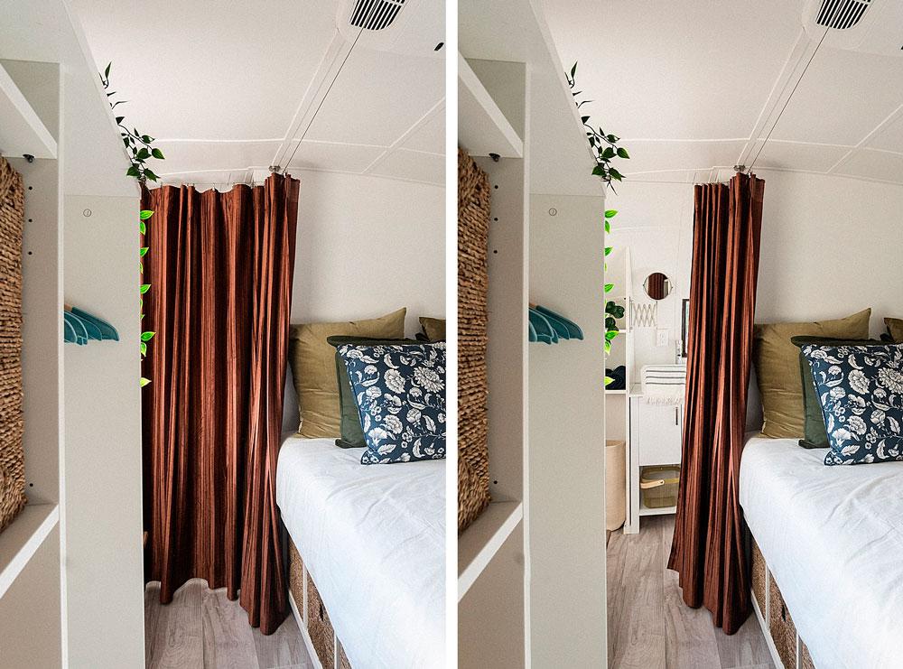 Hacia el otro lado de la caravana, después de la zona de estar, encontramos el dormitorio. Se separa sencillamente a través de unas cortinas. Cuando estas se cierran, la zona de la cama queda ventilada gracias a que a los pies de la cama, se ha resuelto con una celosía a modo de separador de ambientes, de tal manera que dejas que transpire el dormitorio y que entre algo de luz. Además, se ha habilitado gran cantidad de espacio para el almacenaje, tanto bajo la cama como con estanterías para guardar ropa, libros, etc.