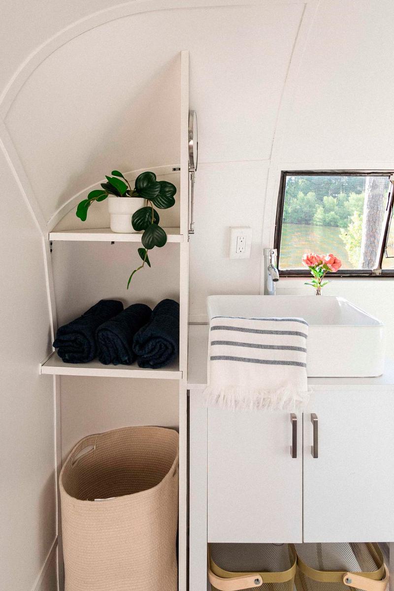 Y llegamos al extremo, para encontrarnos con el baño, sin duda el más completo que he visto nunca en una caravana. ¿No os habéis fijado que normalmente la ducha y el inodoro comparten un mismo espacio? Siempre he pensado lo poco práctico que es esto, ya que es imposible ducharte sin mojar el resto. Sin embargo es la primera vez que veo que cada pieza tiene su lugar, una ducha independiente (además la propia forma de la caravana ha permitido hacer un banco en su parte redondeada, lo que me parece súper práctico), tiene la zona de lavabo que se ha aprovechado con un pequeño mueble con almacenaje y cestas en su parte inferior y a su lado también, una pequeña estantería sirve para colocar más enseres de baño, toallas, etc. Entre la ducha y el lavabo se encuentra el inodoro. Vaya, que he visto casas que no tienen un baño tan completo.