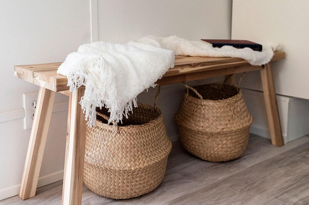 Según entramos disponemos de un banco de madera con cestos de mimbre que hace las veces de recibidor. Comparte espacio con el televisor que va colgado sobre la pared sin interrumpir el paso ni molestar visualmente, ya que justo frente a este, se encuentra la zona de estar con un gran sofá en color verde de aire mid-century, que además se hace cama por lo que permite que duerman dos personas más.