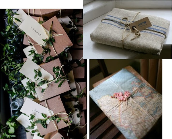 Y dentro de esta nueva manera de enviar paquetes bonitos, entran en juego diferentes materiales que se han convertido en imprescindibles a la hora de envolver: cuerda, papel kraft y washi tapes, unas pegatinas (en las fotos de arriba son rojas) que sirven para casi todo. Después unas ramitas, unos sellos muy vintage, tipografías antiguas o a mano, trozos de tela, o blondas de papel (o lo que se nos ocurra) y voilà!