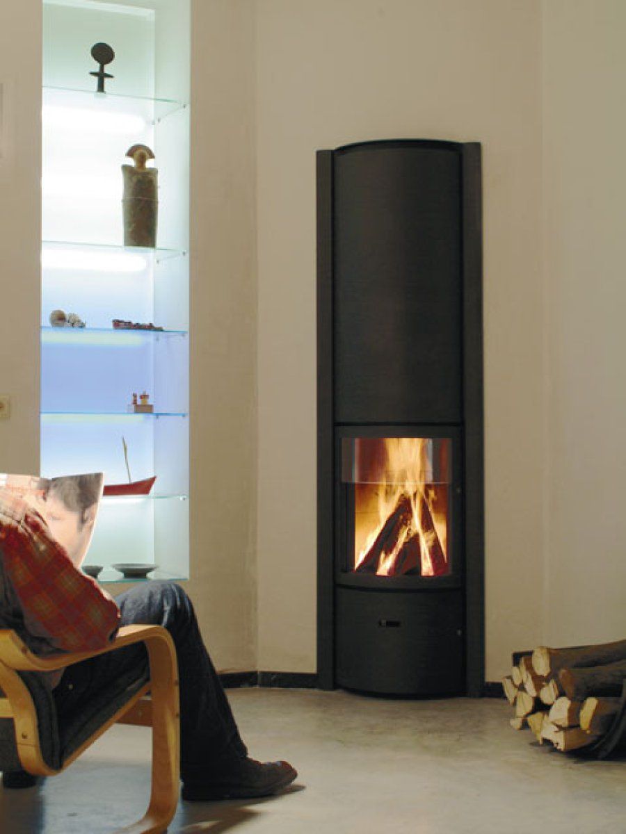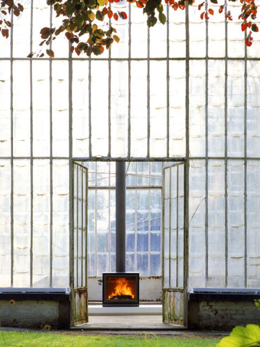 La forma cilíndrica de Stûv 30 es un gran acierto. Esta estufa está provista de tres puertas que posibilitan tres modos de funcionamiento: fuego acristalado, que es el sistema tradicional; fuego abierto, con un cristal únicamente en la zona superior; y fuego continuo, que oculta la llama tras una puerta opaca. Además, hay una versión encastrable: la Stûv 30-in.