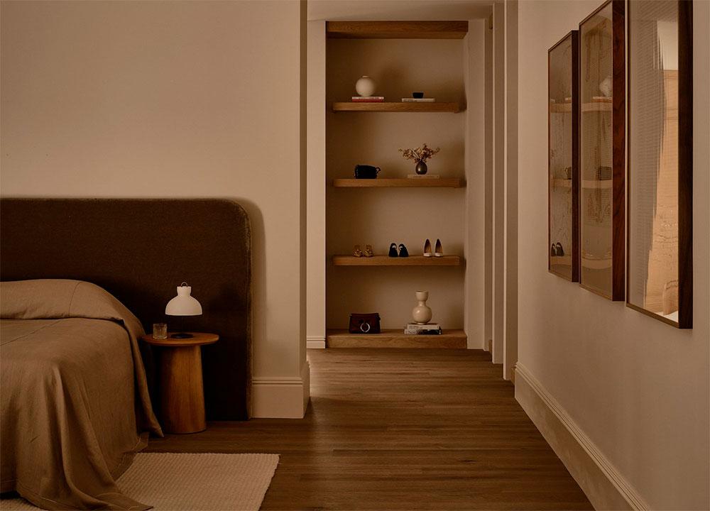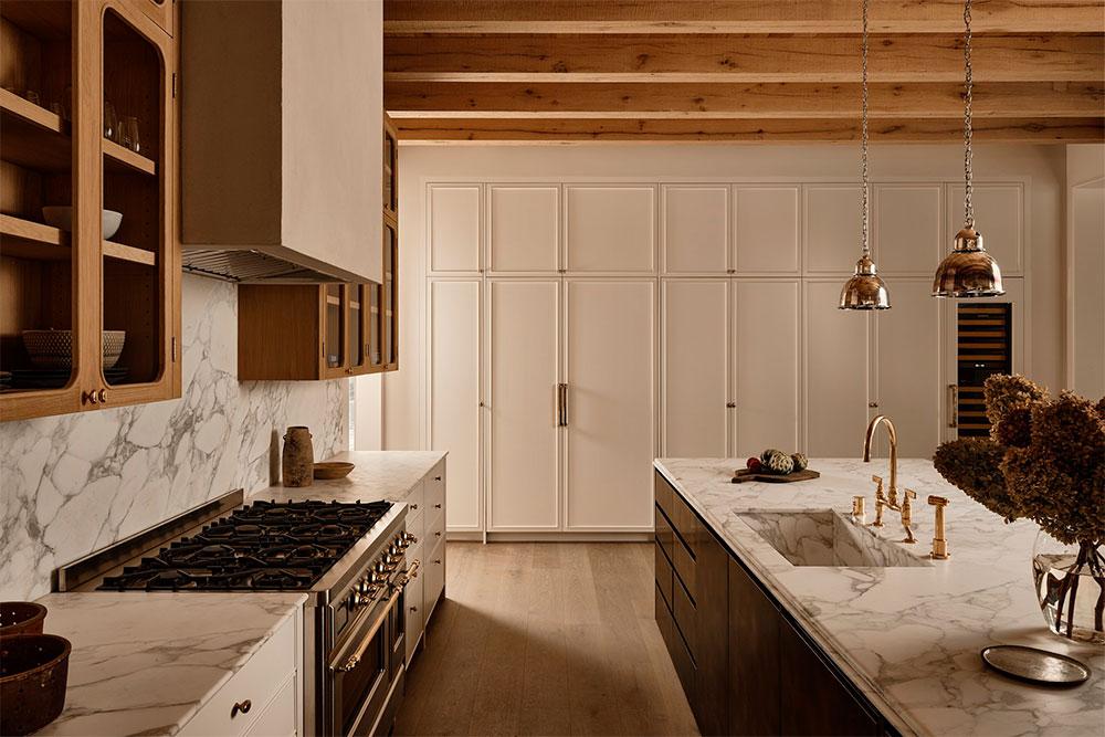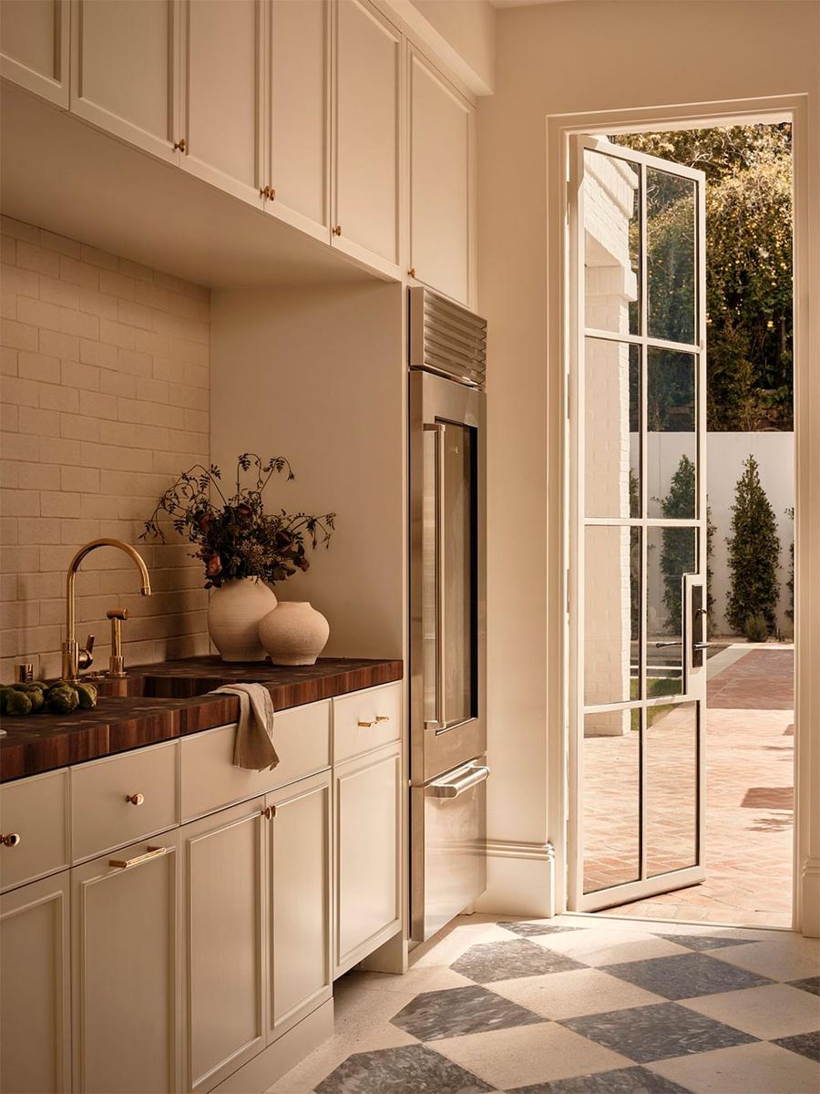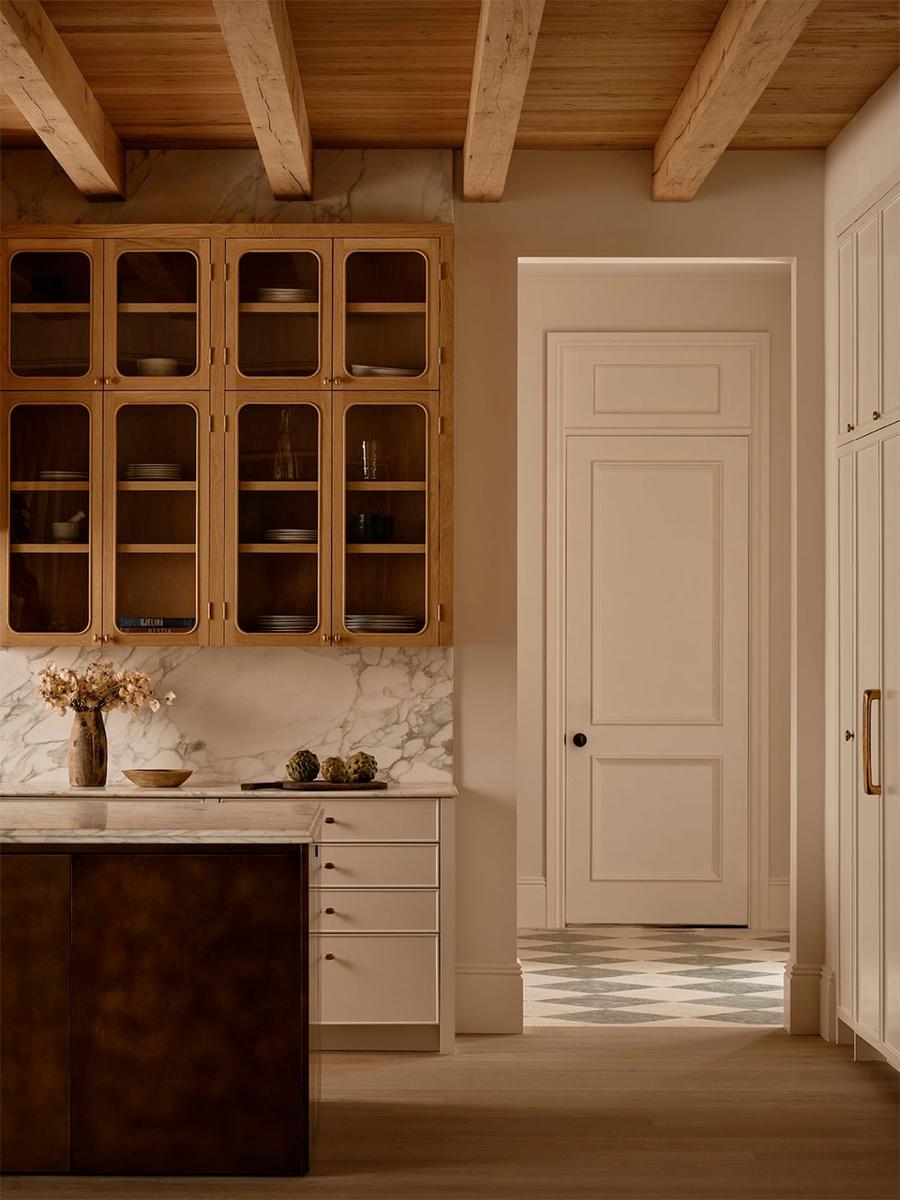 El suelo de mármol y piedra caliza a cuadros, dirigen la mirada a las áreas de más interés. Una de ellas es la cocina, donde la interiorista mezcló varios materiales para crear esa sensación de espacio vivido. En ella encontramos zonas diferenciadas, por un lado, la de preparación y cocinado de alimentos, con una gran isla que combina encimera de mármol Calacatta Caldia de la firma Signorino, con un bonito frente de latón. En esta zona, dos vitrinas en roble contrastan con la campana de obra. En otra parte de la cocina, con salida directa al jardín, encontramos un nuevo espacio de lavado, con encimera de nogal y salpicadero de azulejos de cerámica artesanal. Por último, se ha reservado toda una pared para el almacenaje, con armarios de suelo a techo y del mismo tono que la pared o la campana, de tal forma que se crea una bonita continuidad sin sobrecargar el ambiente. Mención aparte, tienen los paneles y vigas de madera del techo en este espacio.