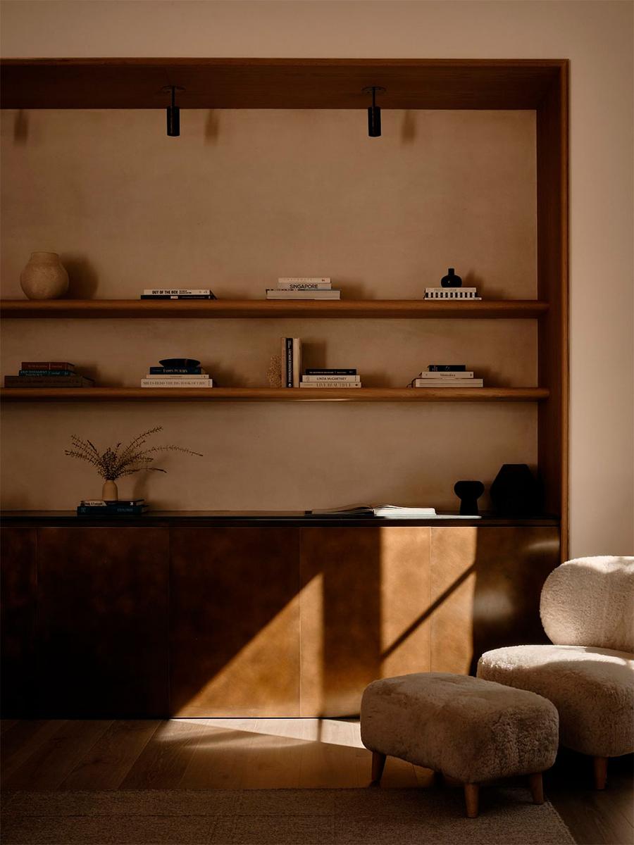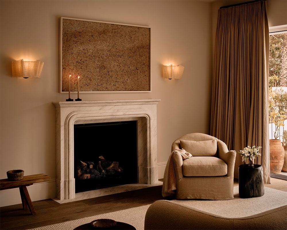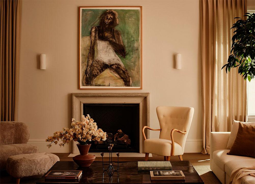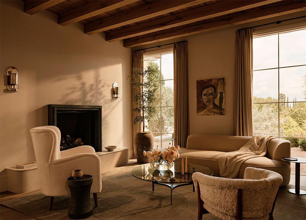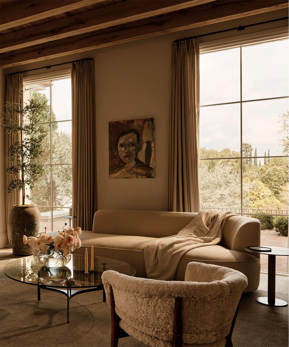 Pasamos a la sala de estar con dos grandes ventanales de acero y corte industrial, que hacen que la luz llegue a todos los rincones de la casa. Si os fijáis en este espacio, las curvas cobran protagonismo, desde el mobiliario (como el sofá, o la mesa de centro, a butaca de tejido de lana bouclè firmada por Erik Wørts Rondell o los apliques antiguos de Jamb London) y también las formas arquitectónicas, como la base de la chimenea que se alza sobre un poyete de formas redondeadas. Todo esto permite que haya una mayor fluidez y mejor circulación alrededor de cada pieza.