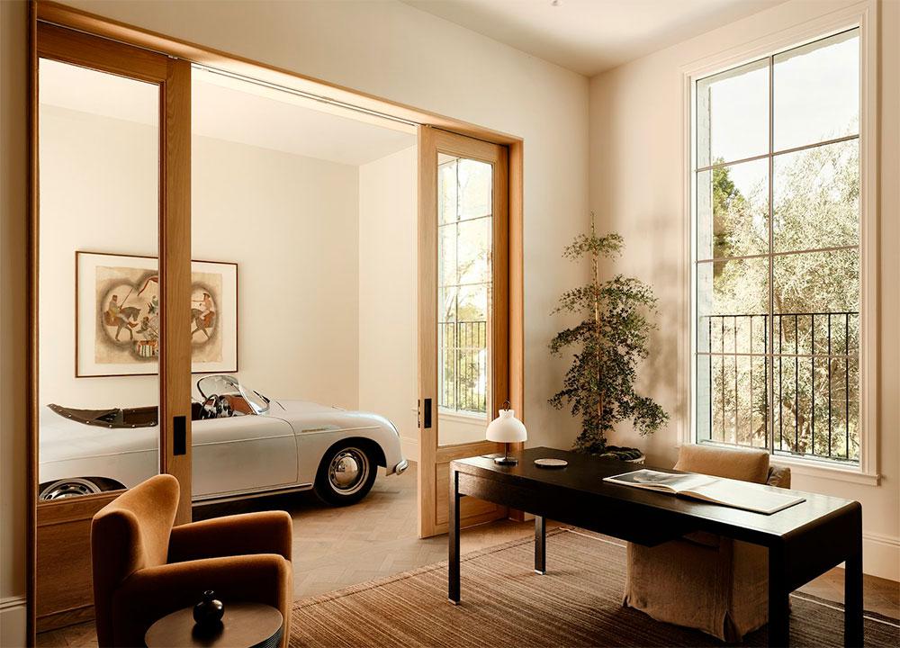 El elemento sorpresa lo encontramos en el despacho, donde se ha habilitado un espacio para albergar un bonito coche deportivo antiguo. Es como una obra expuesta, una escultura. Preciosa la idea siempre y cuando tengas el espacio, claro.