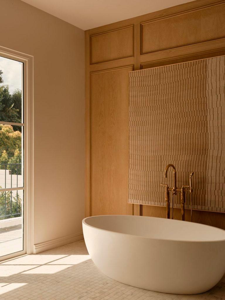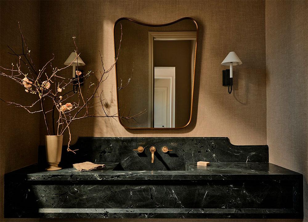 El dormitorio principal y el baño siguen la misma línea que el resto de la casa. Colores envolventes, textiles elegantes como el terciopelo que cubre la cama, materiales nobles (mármol y roble) y un claro propósito de seguir combinando lo nuevo con lo antiguo, por ejemplo, la mezcla de una bañera oval y corte contemporáneo, junto a un lavabo clásico en mármol y el espejo vintage.