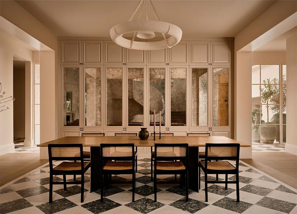 Es en el comedor, donde más se advierte el encanto antiguo, aunque en realidad sin serlo, ya que hablamos de una casa de nueva construcción, pero donde se han combinado a la perfección, elementos clásicos, contemporáneos y rústicos, creando un ambiente ecléctico y de aspecto vivido. Sin duda donde más se aprecia es en los armarios panelados con espejos antiguos que contrastan con la gran mesa de comedor de roble en líneas rectas y modernas, así como la lámpara hecha a medida al estilo de Jean Michel Frank.