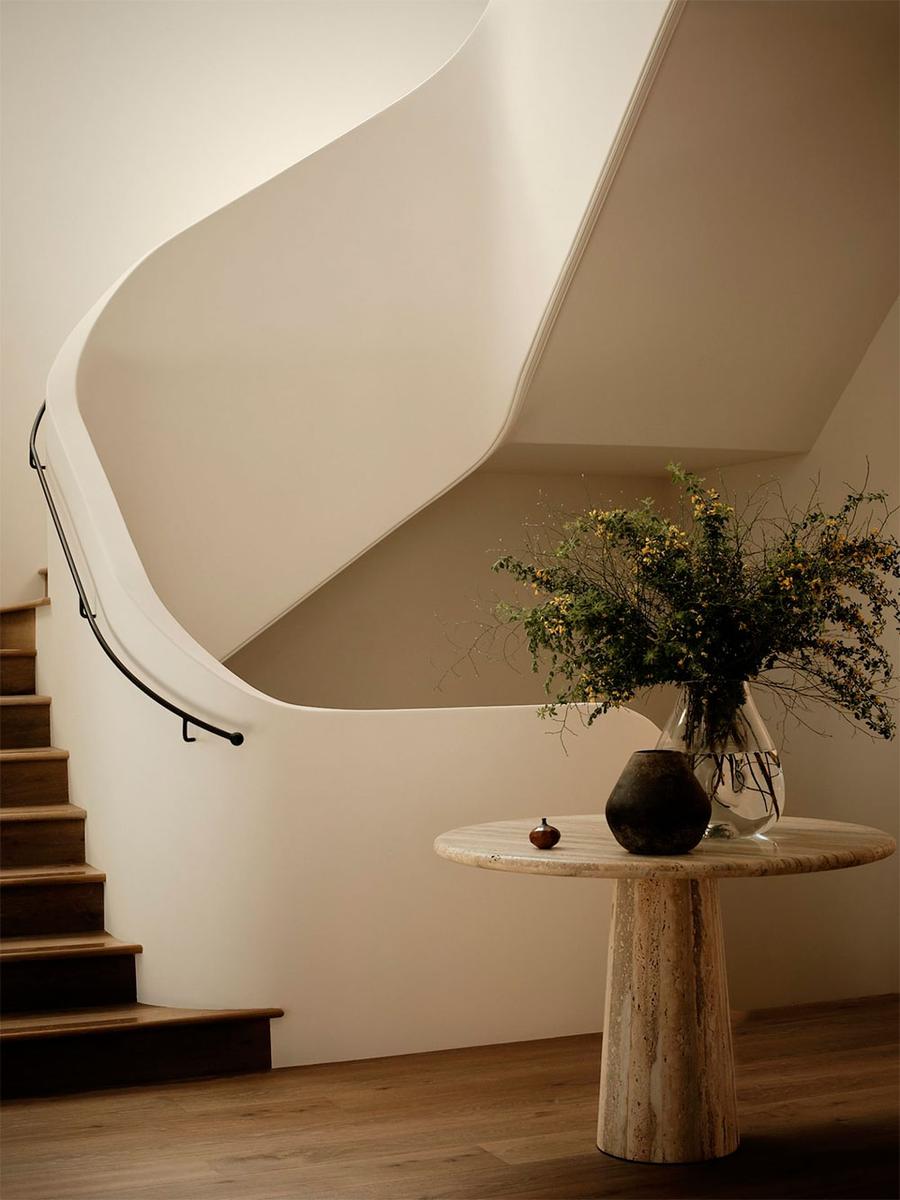 Cruzando la puerta de entrada te recibe una preciosa escalera curva con pasamanos de hierro. Actúa como punto focal y tan sólo es interrumpida por una mesa redonda central con un gran centro de flores. Su desnudez acentúa su belleza.