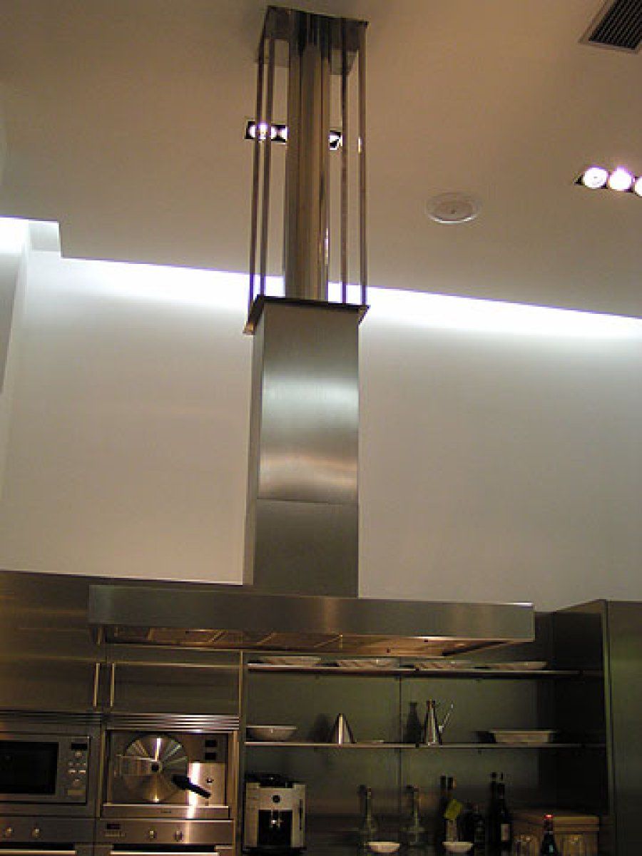 Aumentando la superficie, crecen las posibilidades. Así, cuando la vitrocerámica sigue una distribución en isla, ubicándose en el centro de la cocina, se imponen las campanas extractoras que cuelgan del techo.