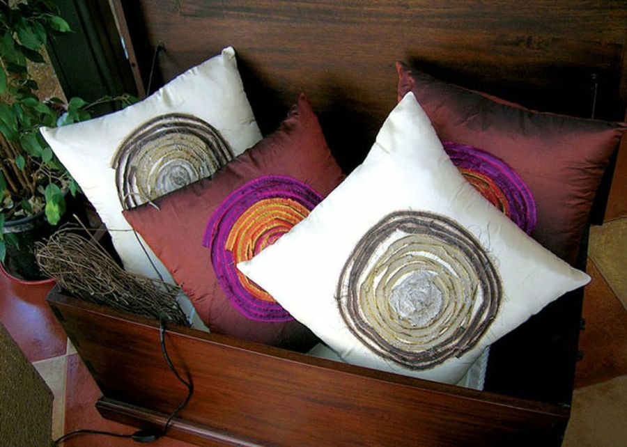 Para el contraste con los tonos claros, opta por los granates y mézclalos. Es una forma de llamar la atención sobre el rincón donde los colocas. Lo último en cojines es coser trozos de tela diseñando formas abstractas para convertirse en los protagonistas de cualquier lugar informal.