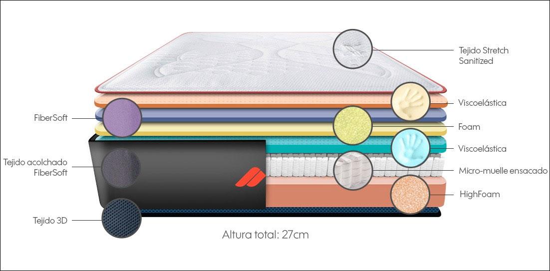 El colchón Morfeo combina viscoelástica, que alivia la presión de nuestro cuerpo, con micromuelles, que permiten la independencia de cada persona, incorpora también materiales termorreguladores que mantienen una perfecta temperatura corporal, además de una capa exterior que protege al colchón de ácaros y bacterias (eliminando los olores) y está diseñado para mantener una perfecta higiene postural mejorando la alineación natural de la espalda. Su altura total es de 27 centímetros.