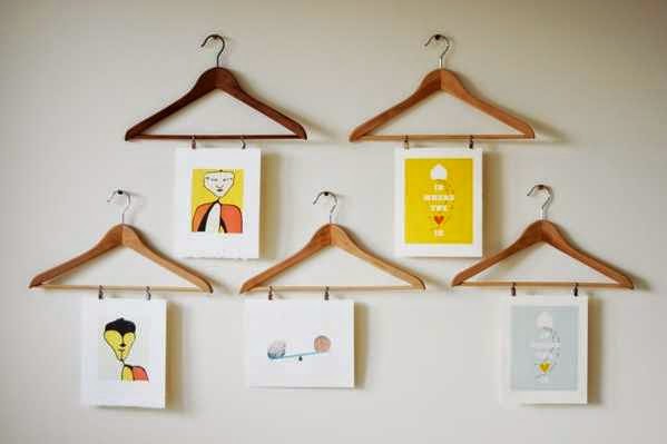 También podemos usar perchas de madera de pinzas para tener un expositor de láminas intercambiables.