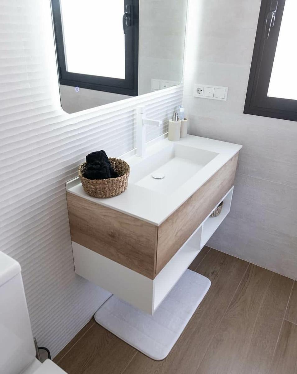 Eso no significa, que lo tengas que seguir a rajatabla. Claro que puedes introducir otro color, para darle ese toque personal y diferente. Por ejemplo en el suelo y en las griferías, como has visto en la imagen anterior.