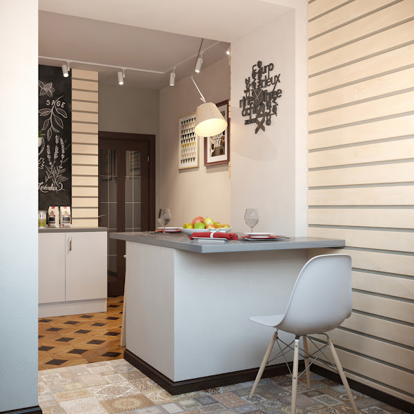 Aprovechando el tabique que existía de separación de abrió hueco para situar encima una barra con bastante amplitud que tuviera función de mesa. Un gran acierto