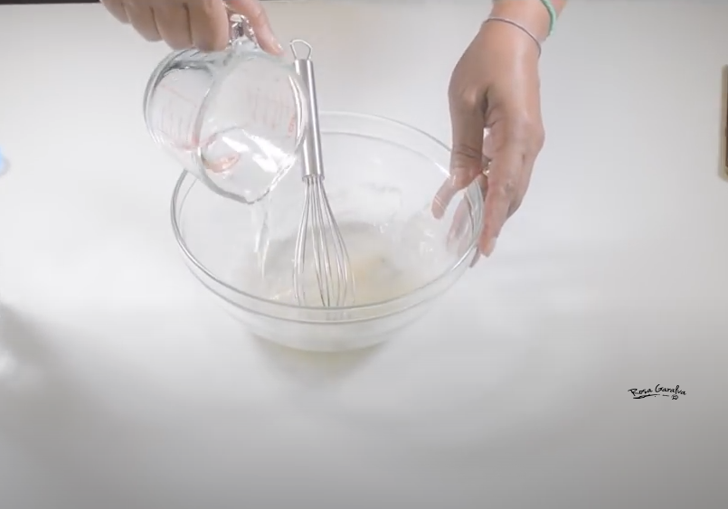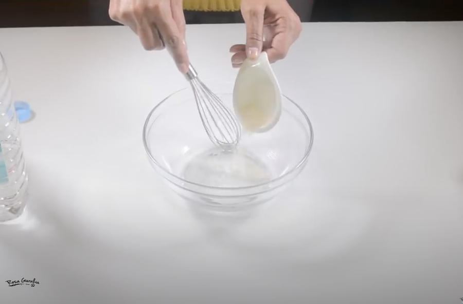 Lo primero será disolver la goma xantana en agua, bate bien hasta que no veas grumos