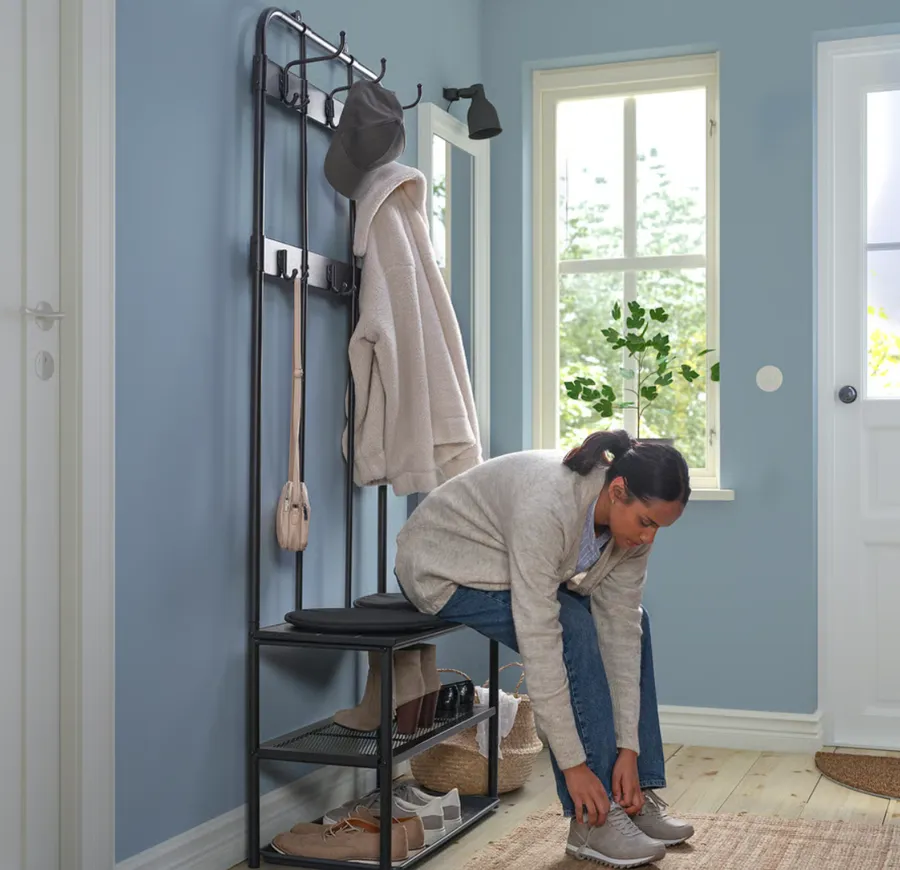 Pero ¿te puedes creer que lo que más ilusión me ha hecho es este perchero y banco con zapatero NIPÅSEN? Pues sí. No me gusta andar calzada por casa, pero tenía que entrar para poder descalzarme bien en un taburete o silla. Ahora, con este artilugio tengo en la entrada todo lo que me hace falta, me siento para quitarme y ponerme los zapatos, que los puedo dejar en la parte de abajo, y además me sirve de perchero. No me digas que no es una chulada. Encima, solo me ha costado 69,99 €