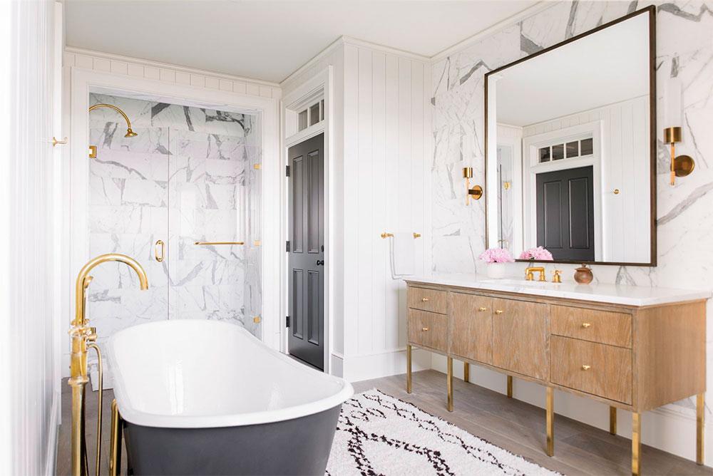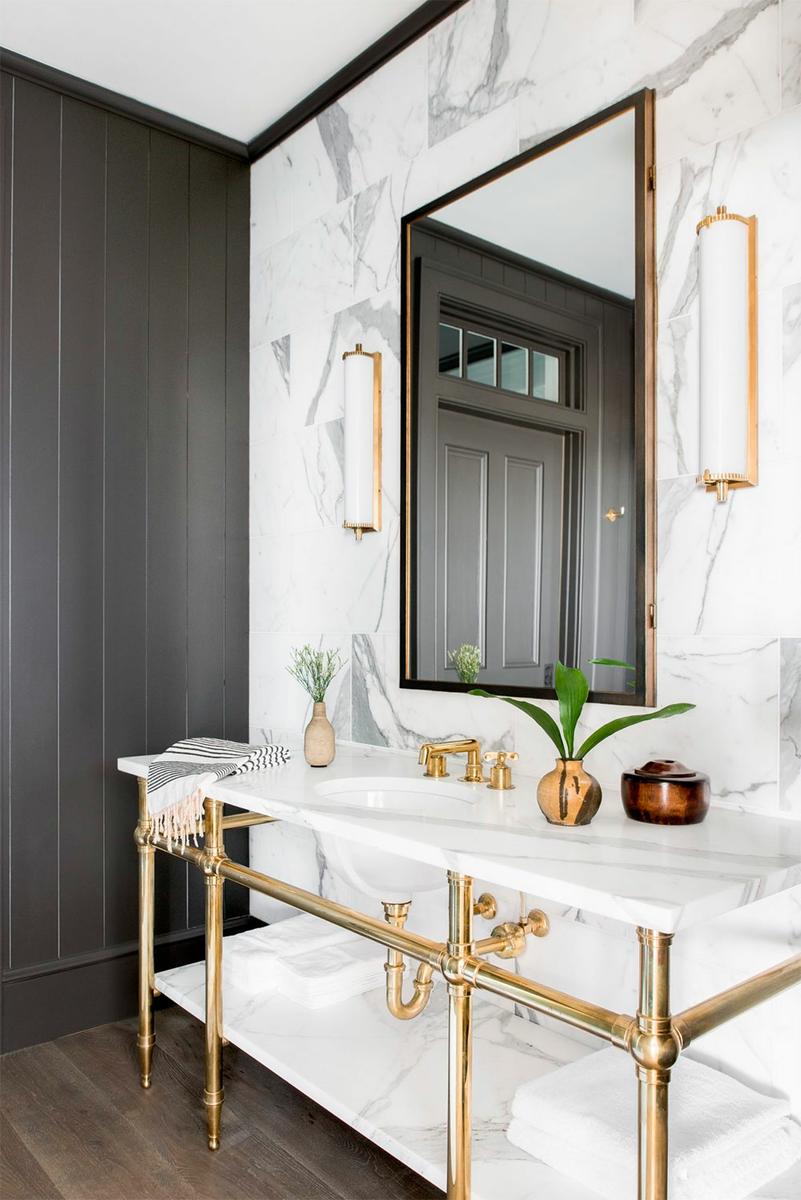 Enamorada me he quedado de los baños también, la combinación del mármol con la bañera exenta negra y el mueble de madera natural con patas doradas es brutal. Pero el baño que más me gusta es el aseo con el lavamanos suspendido en blanco y negro, me ha robado el corazón, hasta que he visto el precio que os diré que he respirado porque por 2.000$ no tengo nada que hacer, podéis verlo aquí (el del otro baño es de la misma firma, ni me he parado a mirar lo que cuesta, para qué :-)).