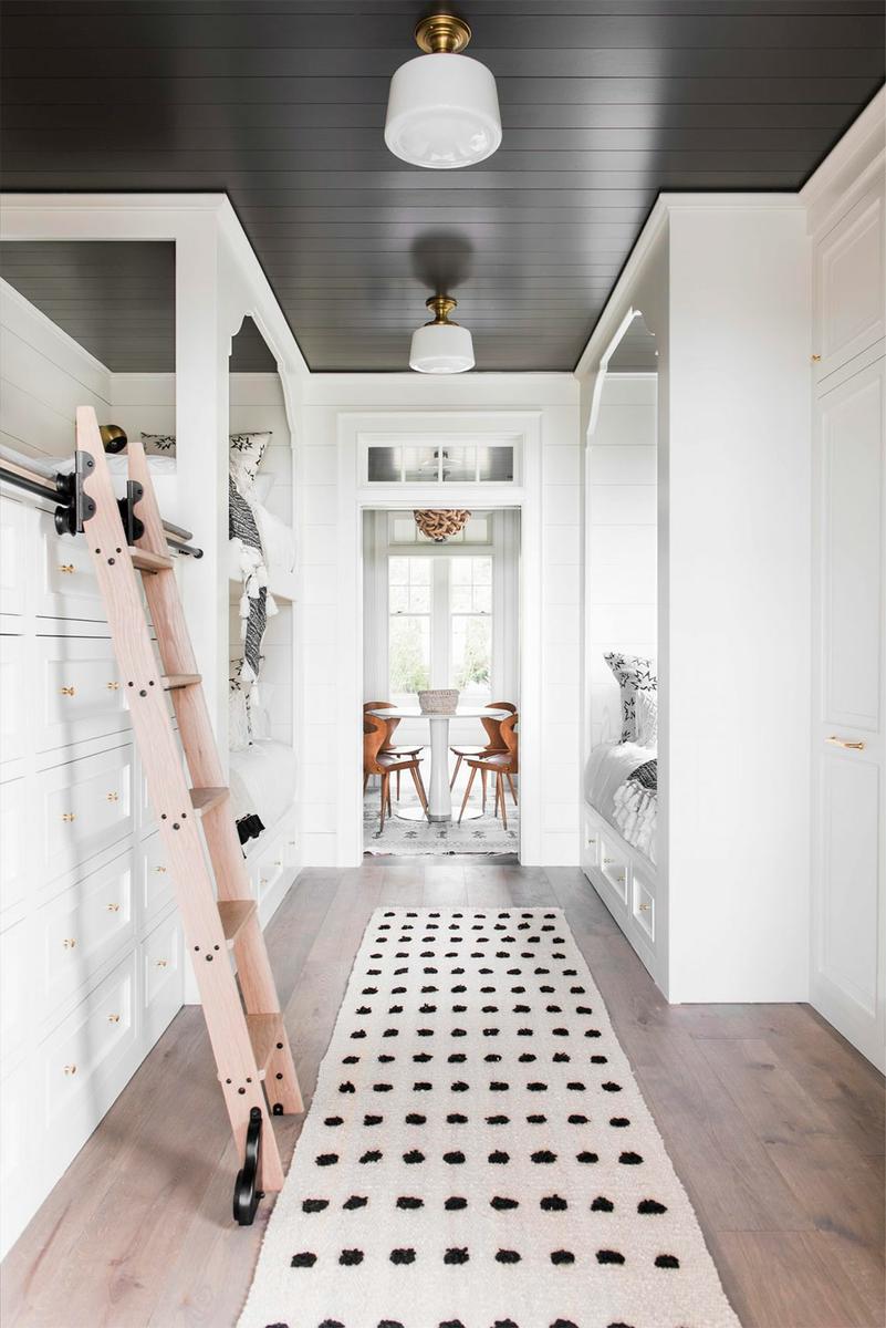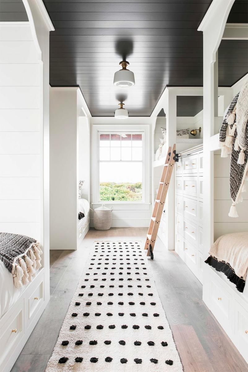 El dormitorio infantil está muy bien resuelto también, seis camas en un mismo espacio, con zona suficiente de almacenaje y otra de juegos al fondo del dormitorio. En un principio he pensado que con una casa tan grande para qué meter a tantos niños en una misma habitación, pero luego he caído que es una casa de vacaciones, así que ¿quién no disfruta durmiendo en plan campamento con primos, amigos, etc? Está muy bien pensado y lo digo por experiencia, en mi casa del pueblo siempre tengo niñas o sobrinas durmiendo con mis hijas y en más de una ocasión me he planteado cambiar las camas convencionales y hacer un dormitorio búnquer con tal de no tener que andar sacando camas de debajo de las camas (ya me entendéis…)