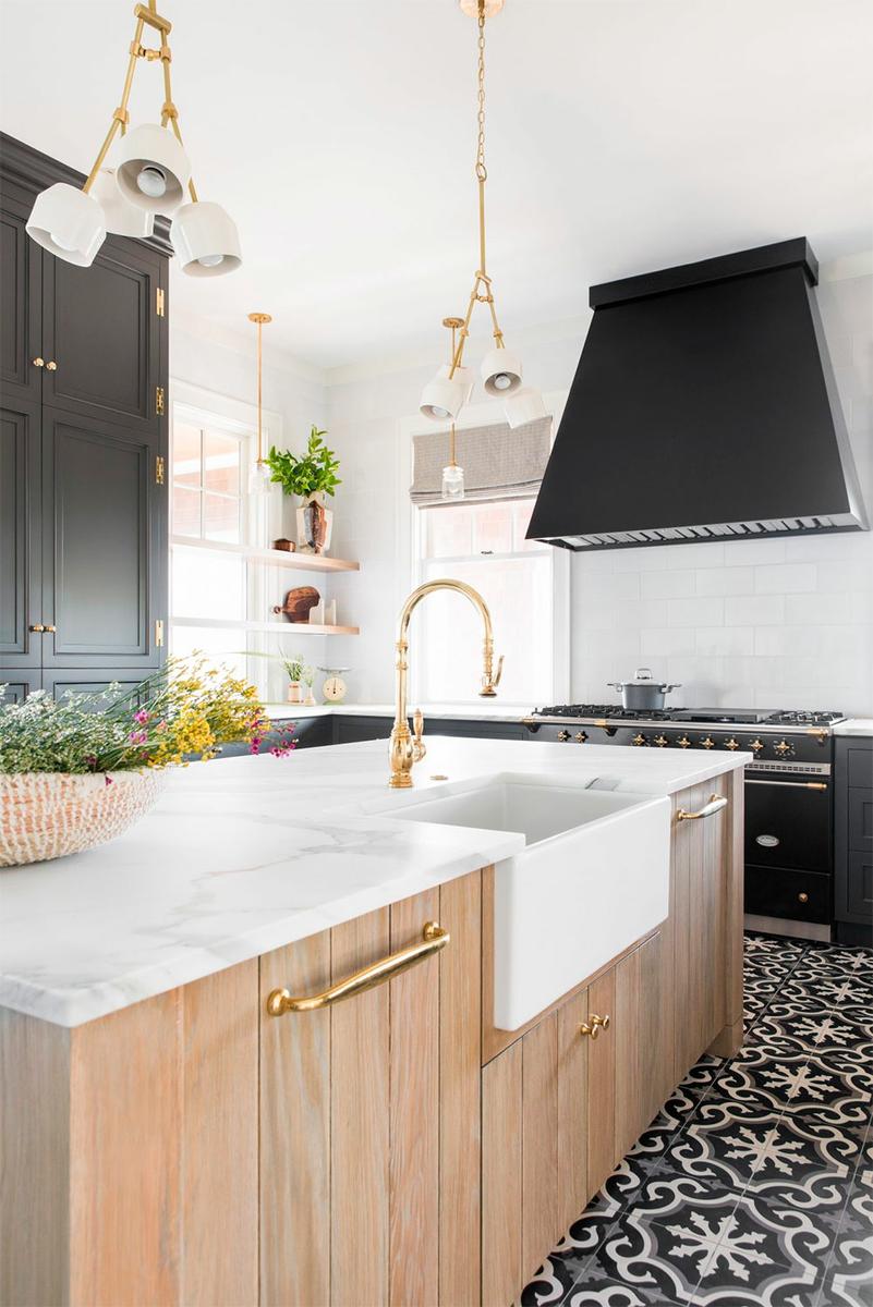 En la cocina, por ejemplo, para romper con la sobriedad del negro predominante, la isla se ha puesto en madera natural, consiguiendo así mayor calidez, y se le han acoplado unos tiradores dorados que le aportan elegancia. A su vez, el suelo hidráulico le da dinamismo y le quita rigidez al espacio. Me parece maravillosa.
