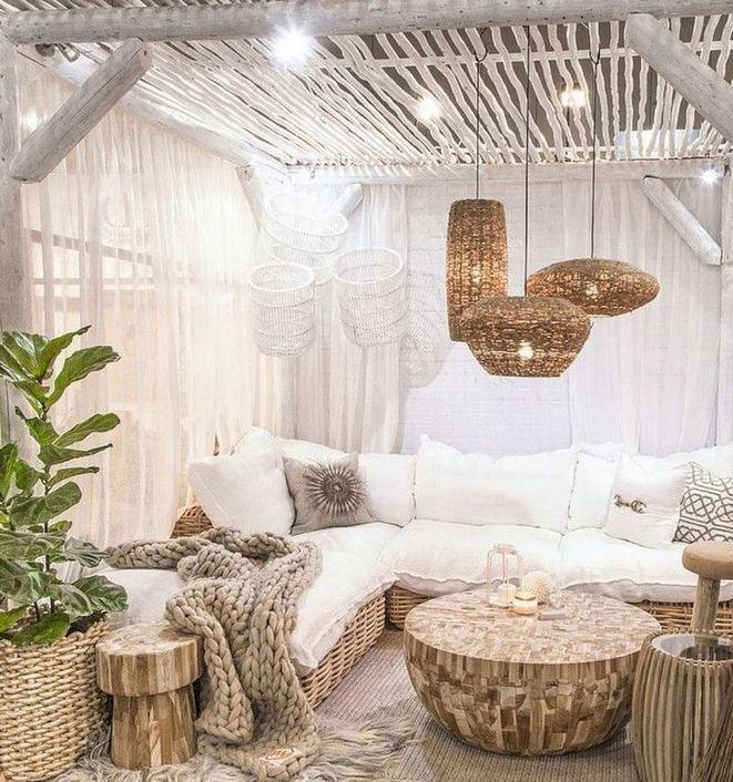 Y si estos materiales nobles, como los muebles de madera natural de exterior, junto con lámparas y otros elementos decorativos de fibras naturales, tales como alfombras, maceteros, mesas auxiliares, espejos y de más… Lo combinas con colores beige y blancos, obtendrás un rollo boho adorable.